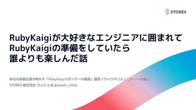 各社の技術広報が明かす「RubyKaigiスポンサーの裏話」運営ノウハウやコミュニティへの想い STORES 株式会社 えんじぇる @sweet_chiho RubyKaigiが大好きなエンジニアに囲まれて RubyKaigiの準備をしていたら 誰よりも楽しんだ話