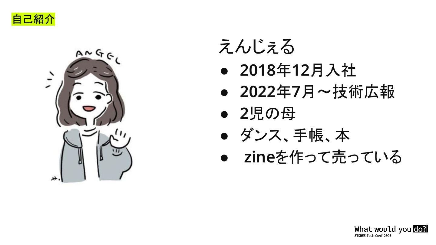 えんじぇる • 2018年12月入社 • 2022年7月〜技術広報 • 2児の母 • ダンス、手帳、本 •