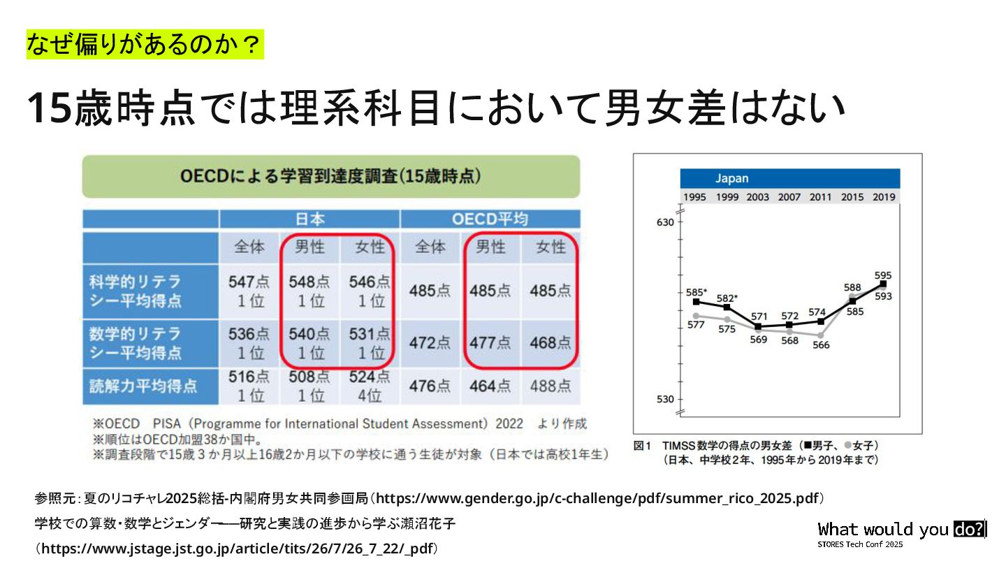 15歳時点では理系科目において男女差はない なぜ偏りがあるのか? 参照元:夏のリコチャレ 2025総括-内閣府男女共同参画局 (https://www.gender.go.jp/c-challenge/pdf/summer_rico_2025.pdf) 学校での算数・数学とジェンダー ──研究と実践の進歩から学ぶ 瀬沼花子 (https://www.jstage.jst.go.jp/article/tits/26/7/26_7_22/_pdf)