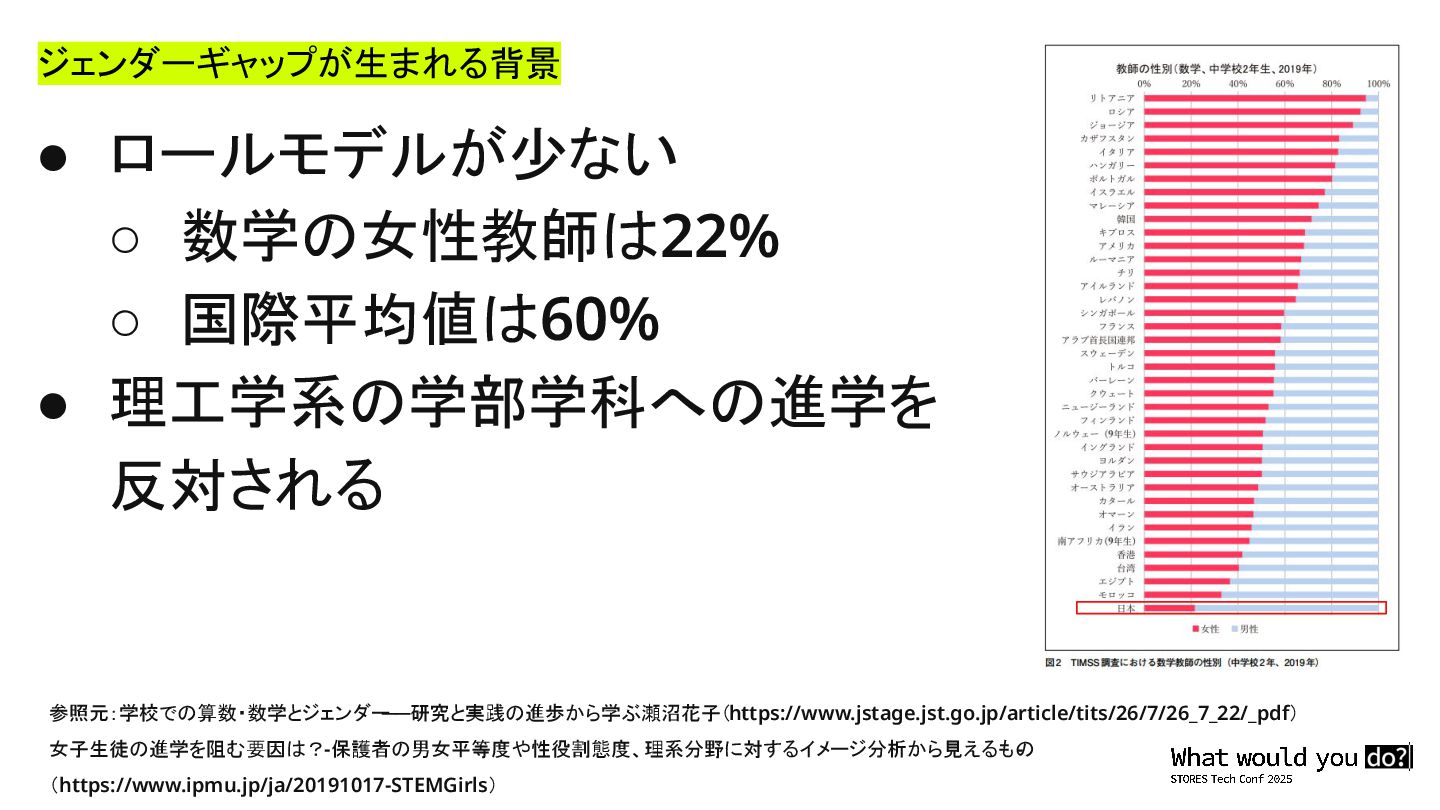 • ロールモデルが少ない ◦ 数学の女性教師は22% ◦ 国際平均値は60% • 理工学系の学部学科への進学を 反対される ジェンダーギャップが生まれる背景
