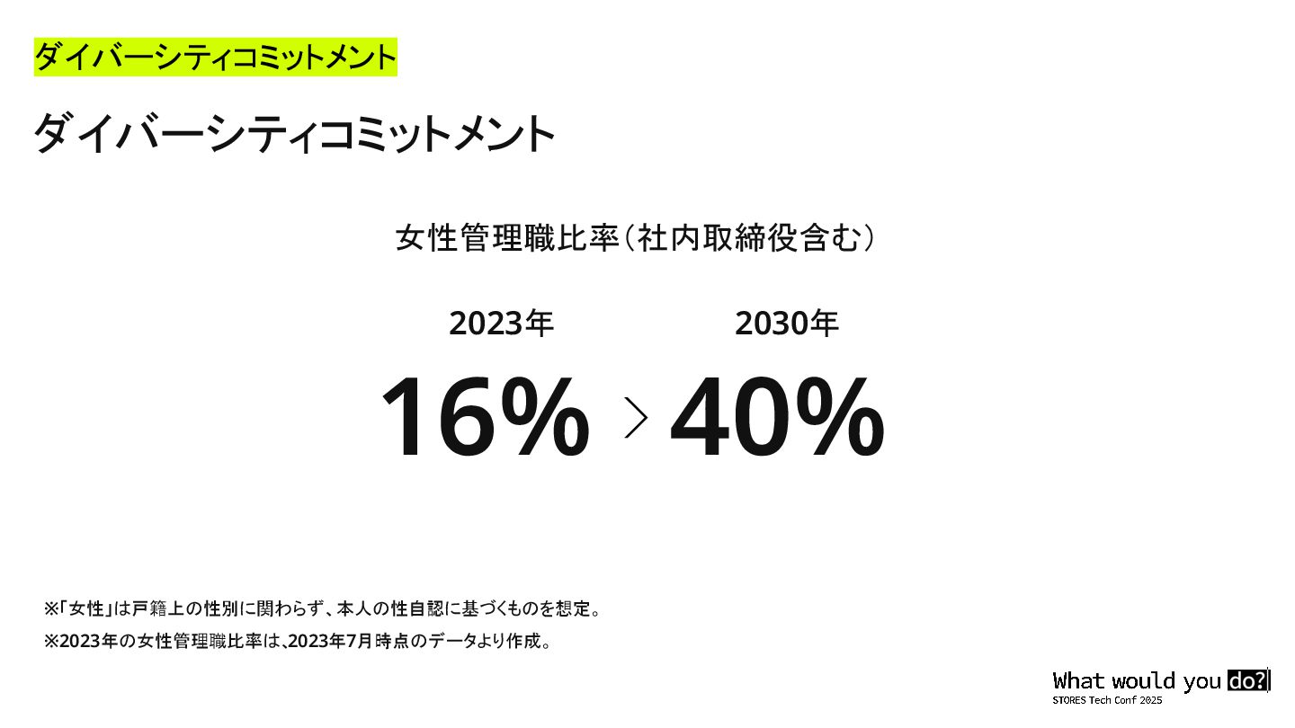 女性管理職比率(社内取締役含む) 2023年 2030年 16% 40% ※「女性」は戸籍上の性別に関わらず、本人の性自認に基づくものを想定。 ※2023年の女性管理職比率は、 2023年7月時点のデータより作成。 ダイバーシティコミットメント