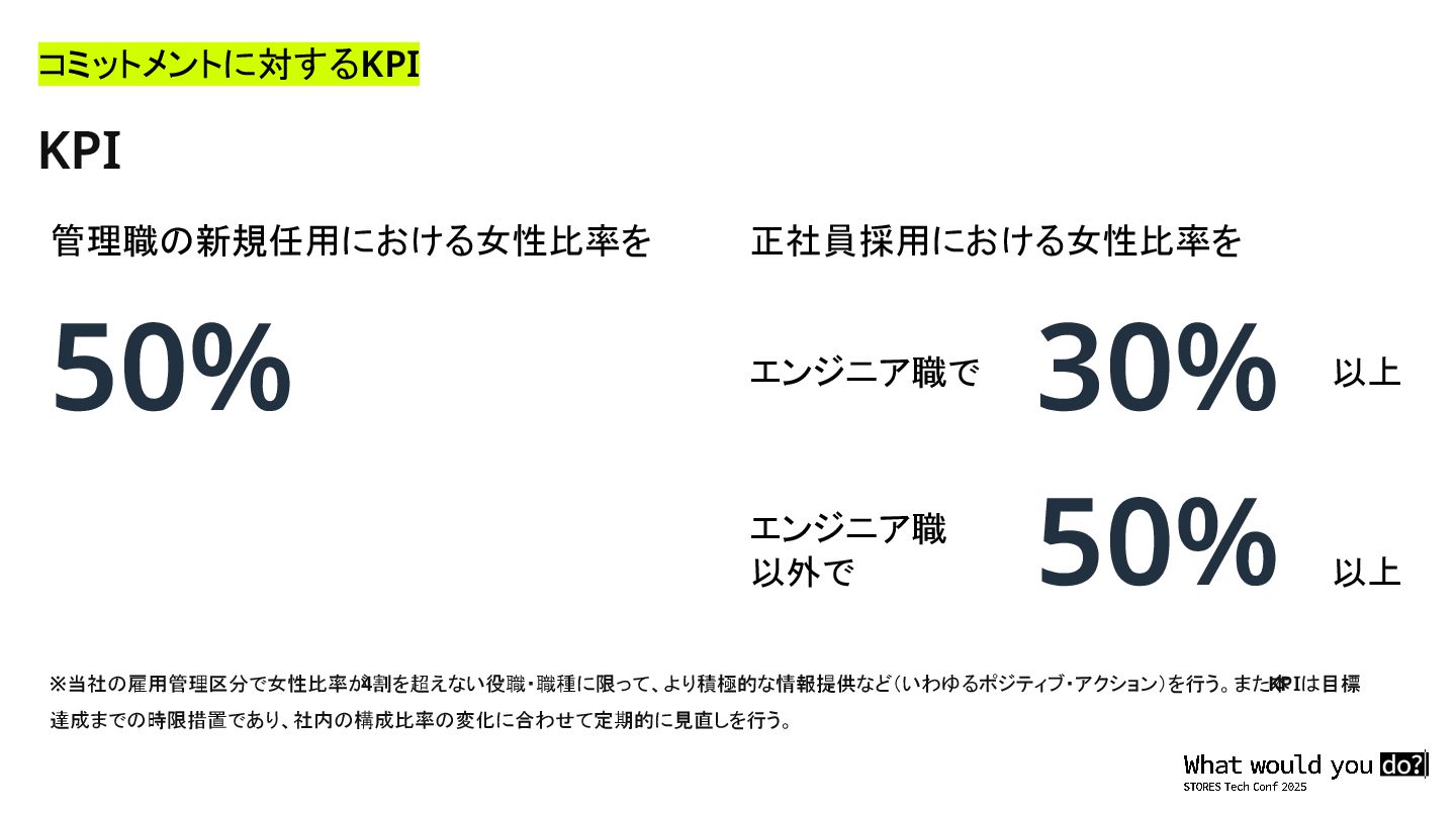 KPI 管理職の新規任用における女性比率を 50% 正社員採用における女性比率を 30% エンジニア職で 50% エンジニア職