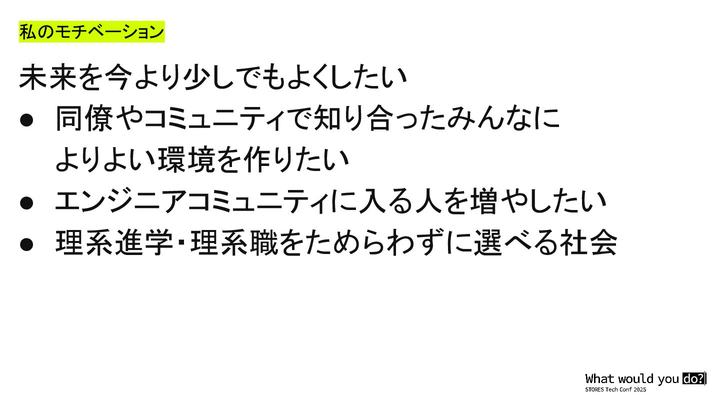 未来を今より少しでもよくしたい • 同僚やコミュニティで知り合ったみんなに よりよい環境を作りたい • エンジニアコミュニティに入る人を増やしたい • 理系進学・理系職をためらわずに選べる社会 私のモチベーション