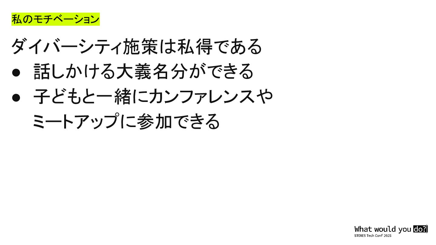 ダイバーシティ施策は私得である • 話しかける大義名分ができる • 子どもと一緒にカンファレンスや ミートアップに参加できる 私のモチベーション