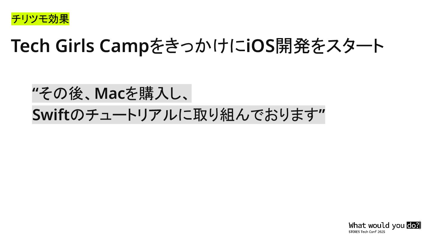 Tech Girls CampをきっかけにiOS開発をスタート “その後、Macを購入し、 Swiftのチュートリアルに取り組んでおります” チリツモ効果