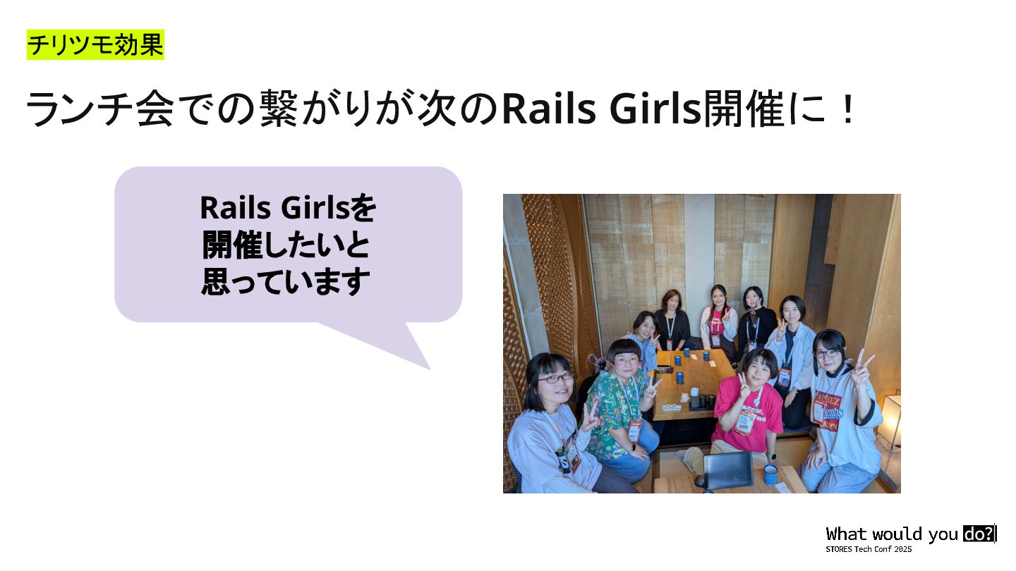 ランチ会での繋がりが次のRails Girls開催に! チリツモ効果 Rails Girlsを 開催したいと 思っています