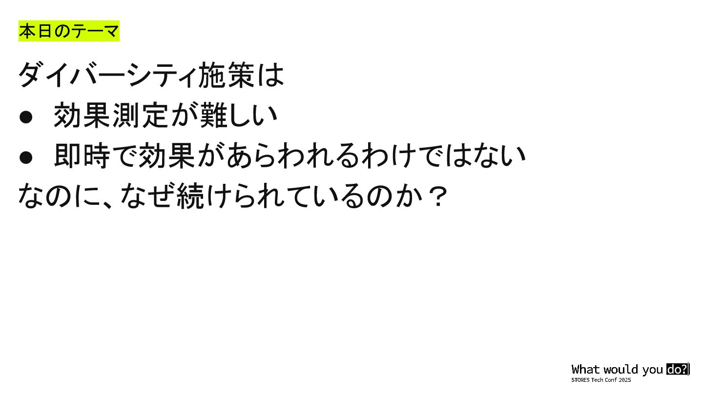 ダイバーシティ施策は • 効果測定が難しい • 即時で効果があらわれるわけではない なのに、なぜ続けられているのか? 本日のテーマ
