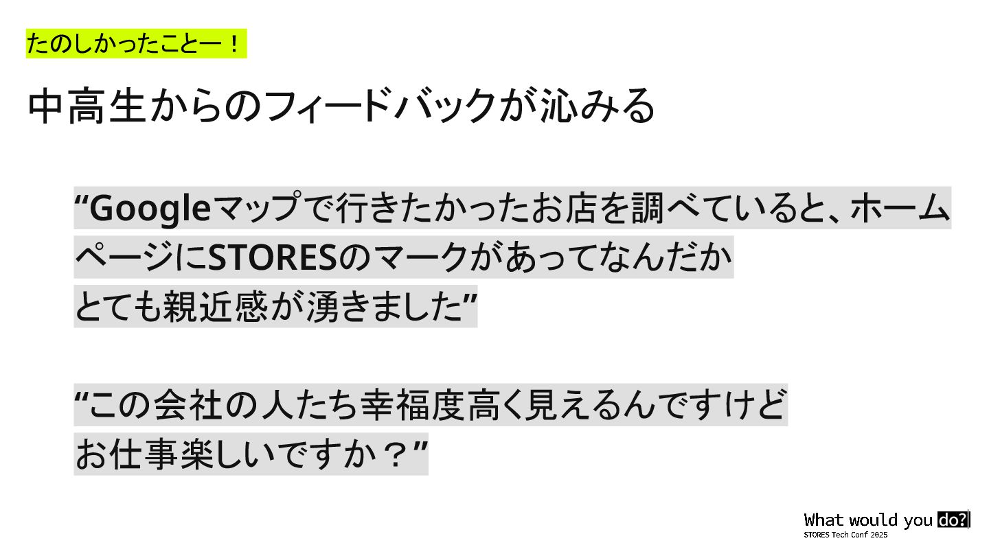 たのしかったことー! 中高生からのフィードバックが沁みる “Googleマップで行きたかったお店を調べていると、ホーム ページにSTORESのマークがあってなんだか とても親近感が湧きました” “この会社の人たち幸福度高く見えるんですけど お仕事楽しいですか?”