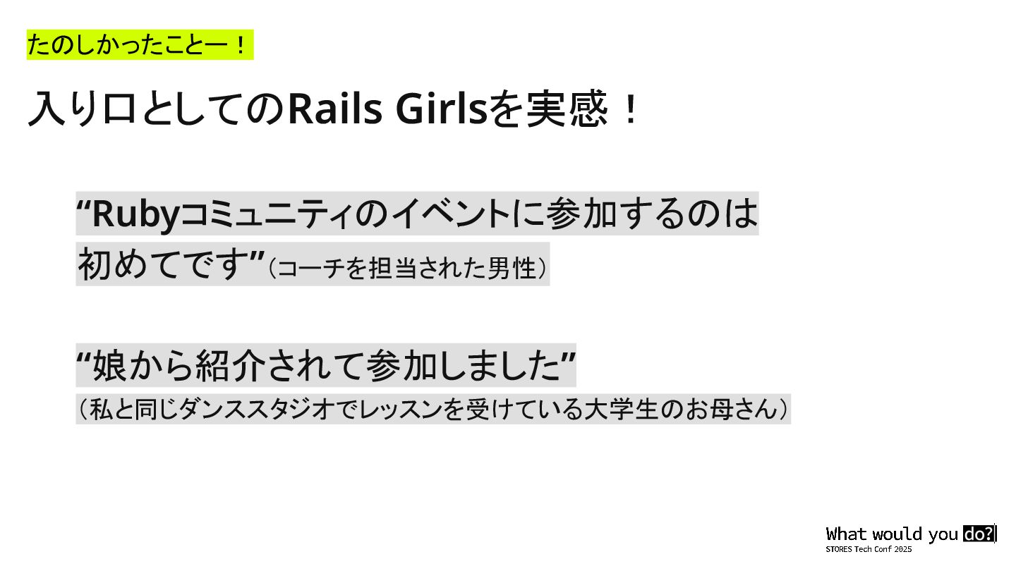 たのしかったことー! 入り口としてのRails Girlsを実感! “Rubyコミュニティのイベントに参加するのは 初めてです”(コーチを担当された男性) “娘から紹介されて参加しました” (私と同じダンススタジオでレッスンを受けている大学生のお母さん)