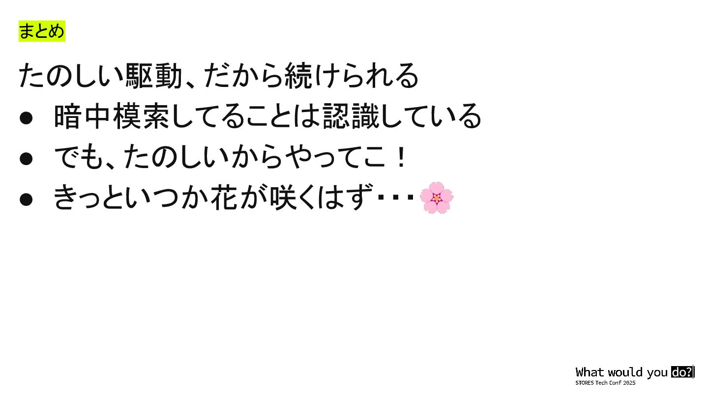 たのしい駆動、だから続けられる • 暗中模索してることは認識している • でも、たのしいからやってこ! • きっといつか花が咲くはず・・・🌸 まとめ