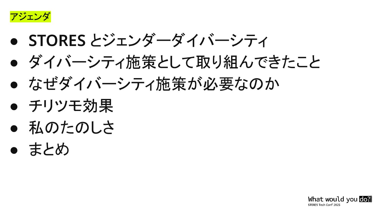 • STORES とジェンダーダイバーシティ • ダイバーシティ施策として取り組んできたこと • なぜダイバーシティ施策が必要なのか • チリツモ効果 •