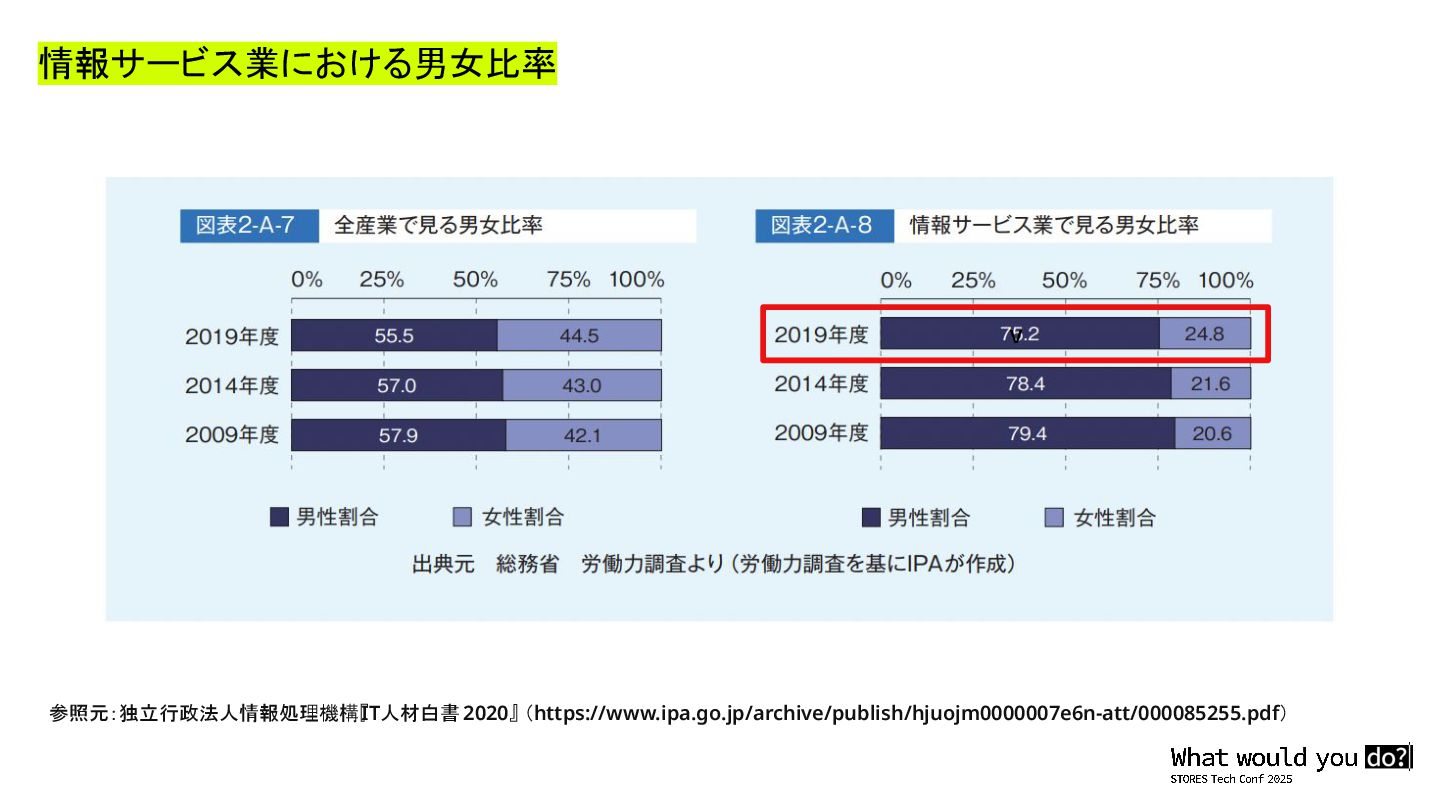 情報サービス業における男女比率 参照元:独立行政法人情報処理機構『 IT人材白書 2020』 (https://www.ipa.go.jp/archive/publish/hjuojm0000007e6n-att/000085255.pdf) v