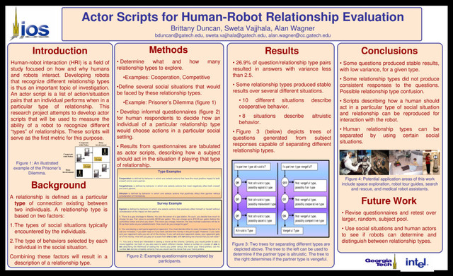 connection existing between two individuals. A relationship type is based on two factors: 1.The types of social situations typically encountered by the individuals. 2.The type of behaviors selected by each individual in the social situation. Combining these factors will result in a description of a relationship type. Methods • Determine what and how many relationship types to explore. •Examples: Cooperation, Competitive •Define several social situations that would be faced by these relationship types. •Example: Prisoner’s Dilemma (figure 1) • Develop informal questionnaires (figure 2) for human respondents to decide how an individual of a particular relationship type would choose actions in a particular social setting. • Results from questionnaires are tabulated as actor scripts, describing how a subject should act in the situation if playing that type of relationship. Results • 26.9% of question/relationship type pairs resulted in answers with variance less than 2.5. • Some relationship types produced stable results over several different situations. • 10 different situations describe cooperative behavior. • 8 situations describe altruistic behavior. • Figure 3 (below) depicts trees of questions generated from subject responses capable of separating different relationship types. Conclusions • Some questions produced stable results, with low variance, for a given type. • Some relationship types did not produce consistent responses to the questions. Possible relationship type confusion. • Scripts describing how a human should act in a particular type of social situation and relationship can be reproduced for interaction with the robot. • Human relationship types can be separated by using certain social situations. Future Work • Revise questionnaires and retest over larger, random, subject pool. • Use social situations and human actors to see if robots can determine and distinguish between relationship types. Actor Scripts for Human-Robot Relationship Evaluation Brittany Duncan, Sweta Vajjhala, Alan Wagner