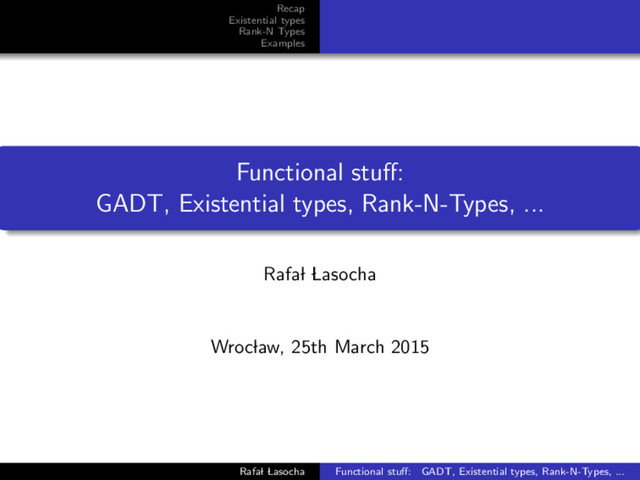 with types Existential types type Tr t a b = (t a b,a,t a b) data Red t a b = C (t a b) | R (Tr t a b) data Black a b = E | B(Tr (Red Black) a [b]) balanceL :: Red (Red Black) a [b] -> a -> Red Black a [b] -> Red Bl balanceL (R(R(a,x,b),y,c)) z d = R(B(C a,x,C b),y,B(c,z,d)) balanceL (R(a,x,R(b,y,c))) z d = R(B(a,x,C b),y,B(C c,z,d)) balanceL (R(C a,x,C b)) z d = C(B(R(a,x,b),z,d)) balanceL (C a) x b = C(B(a,x,b)) Rafal Lasocha Functional stuff: GADT, Existential types, Rank-N-Types, ...