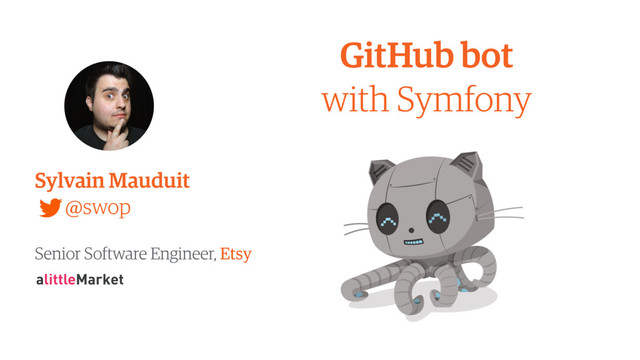 In this talk, we're gonna learn how to make our own bots to interact with GitHub, by using both GitHub web hooks and GitHub API in PHP, and we'll see how some packages/bundles could help us in Symfony.
