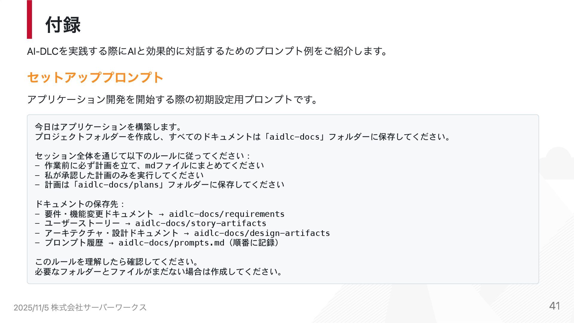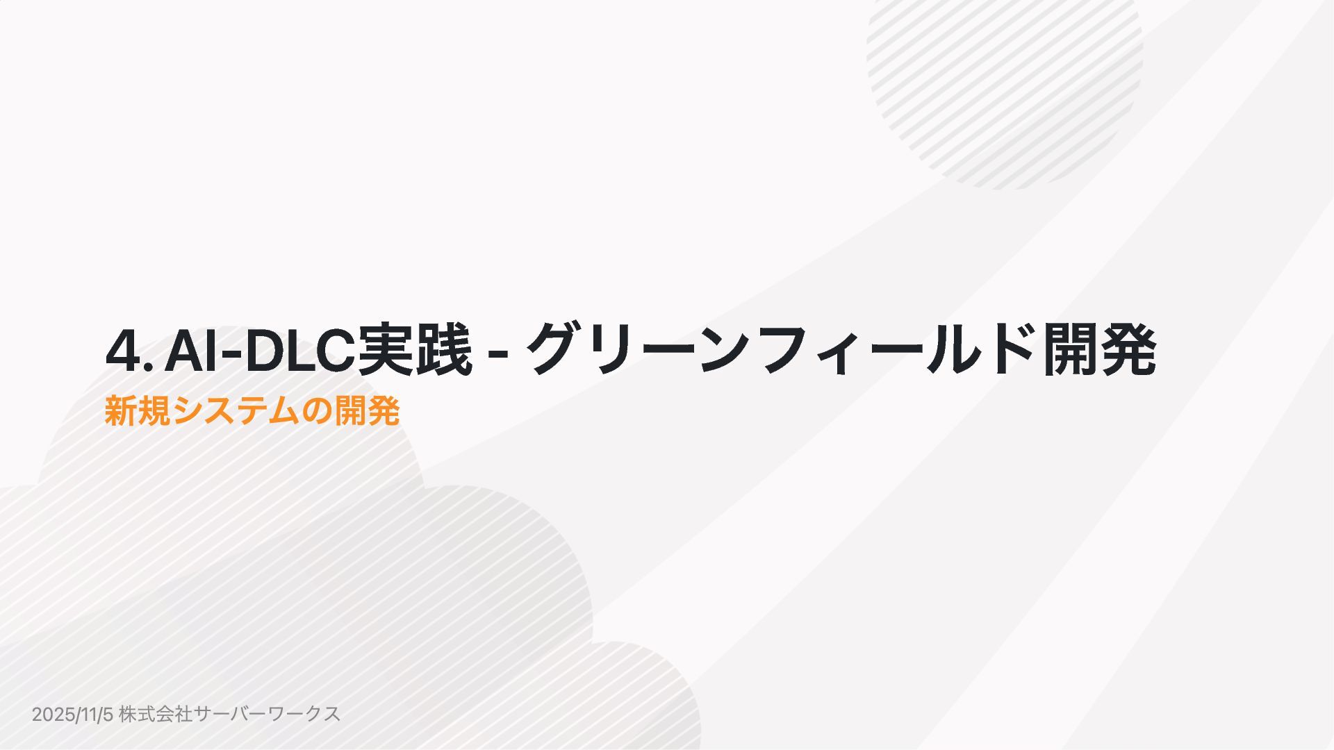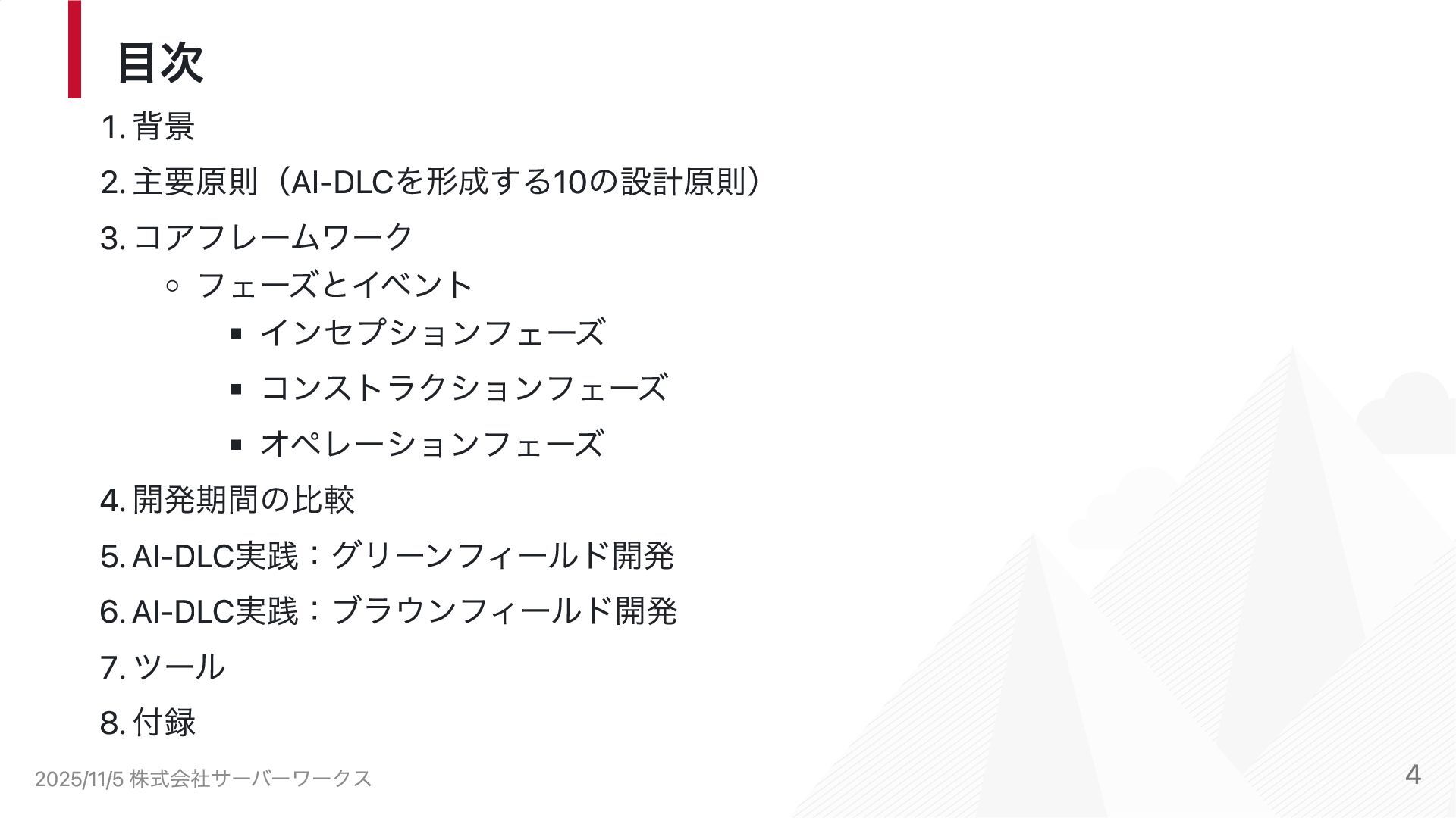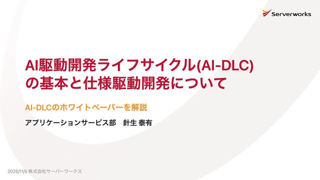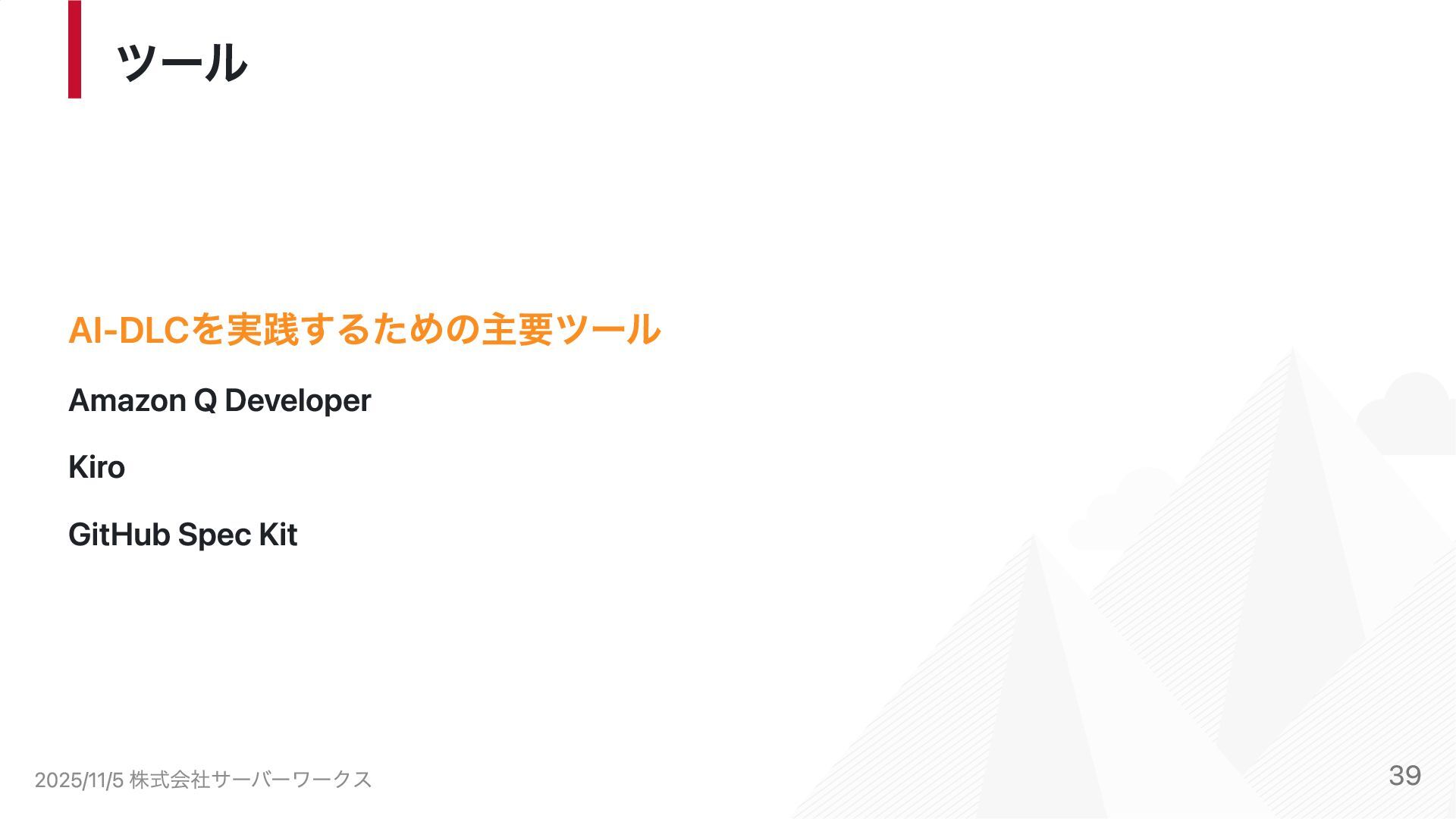 株式会社サーバーワークスの社内勉強会でAI駆動開発ライフサイクル(AI-DLC)や仕様駆動開発についての発表をしたときに作成した資料です。