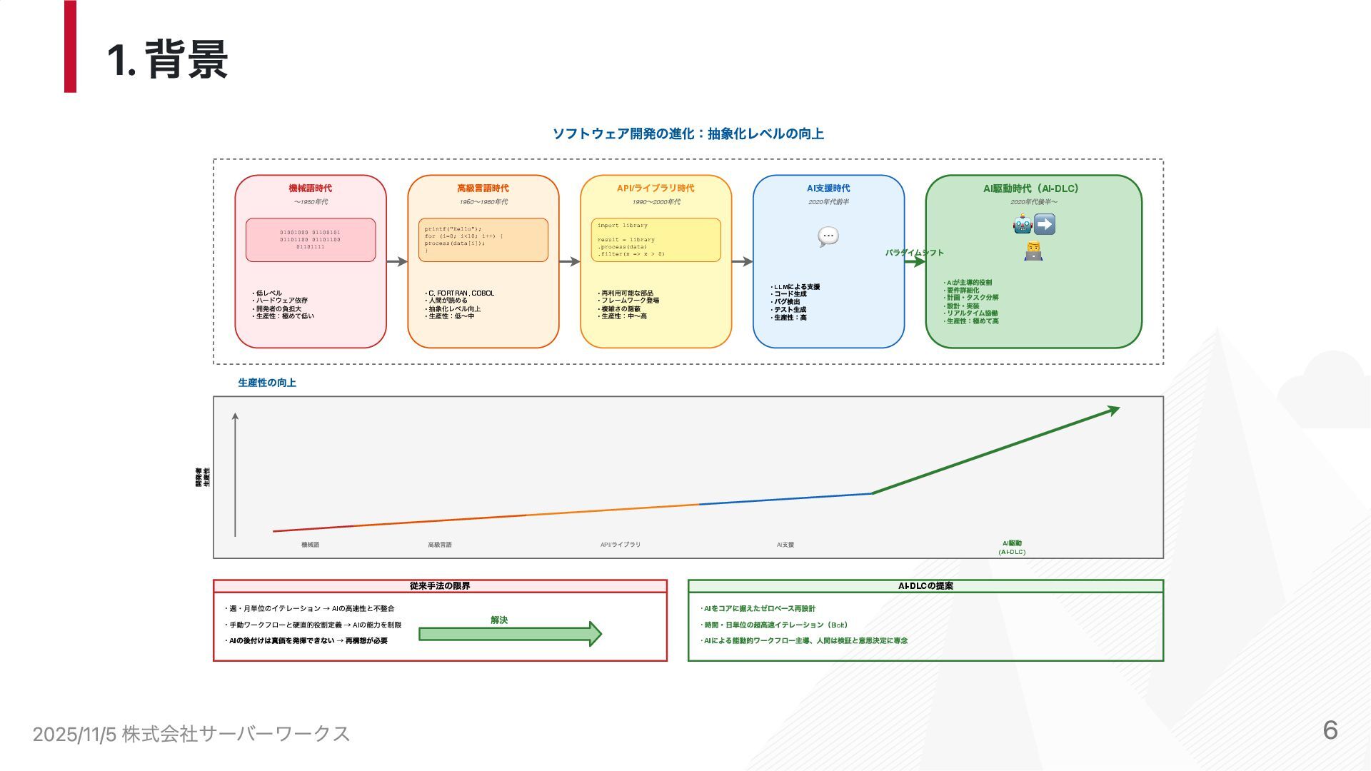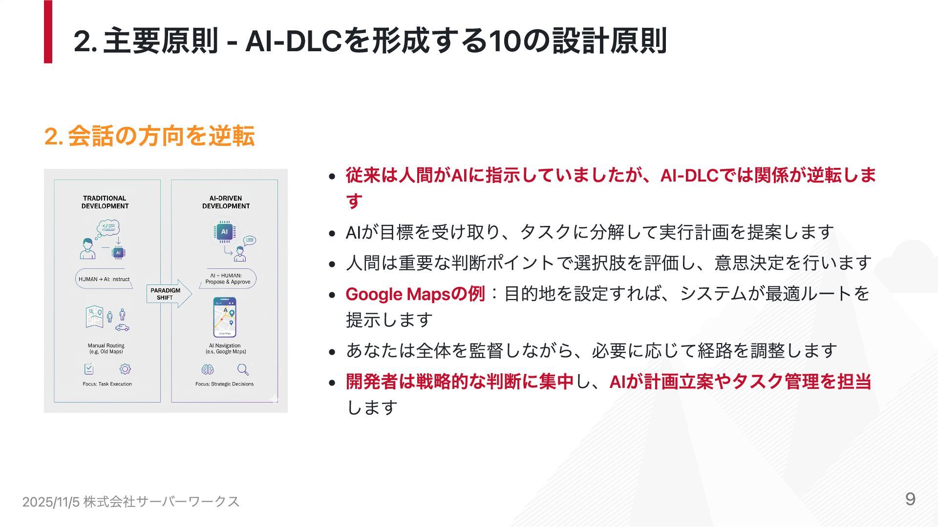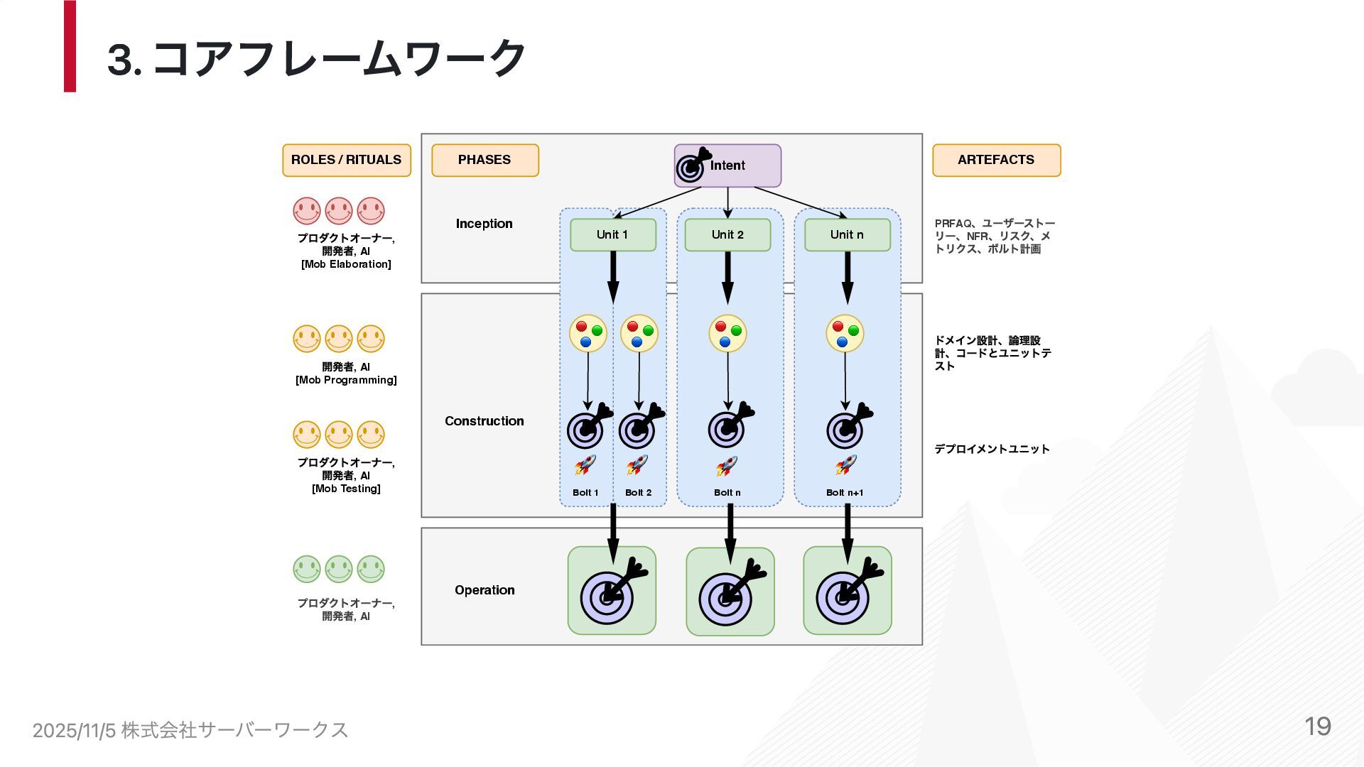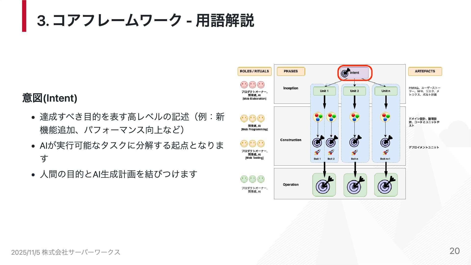 株式会社サーバーワークスの社内勉強会でAI駆動開発ライフサイクル(AI-DLC)や仕様駆動開発についての発表をしたときに作成した資料です。