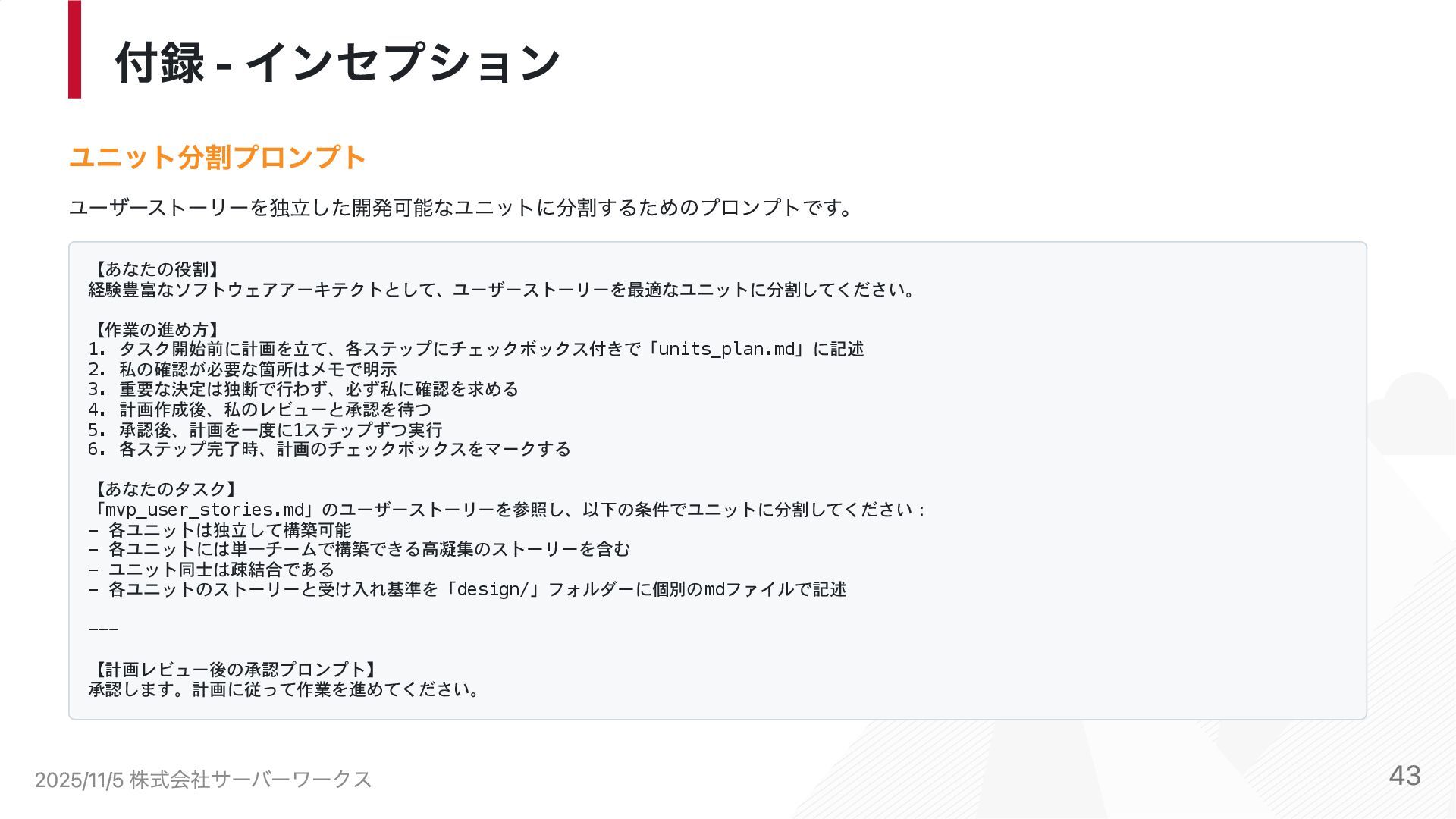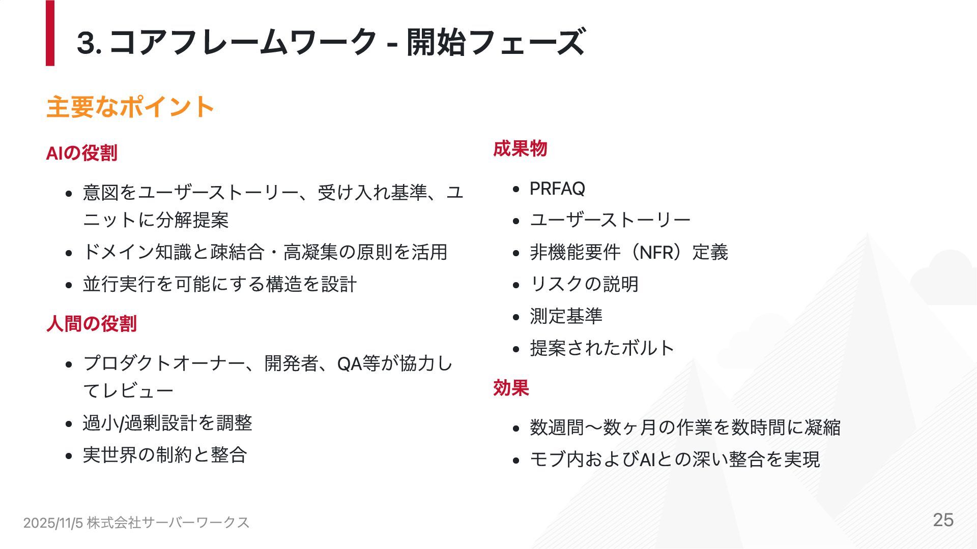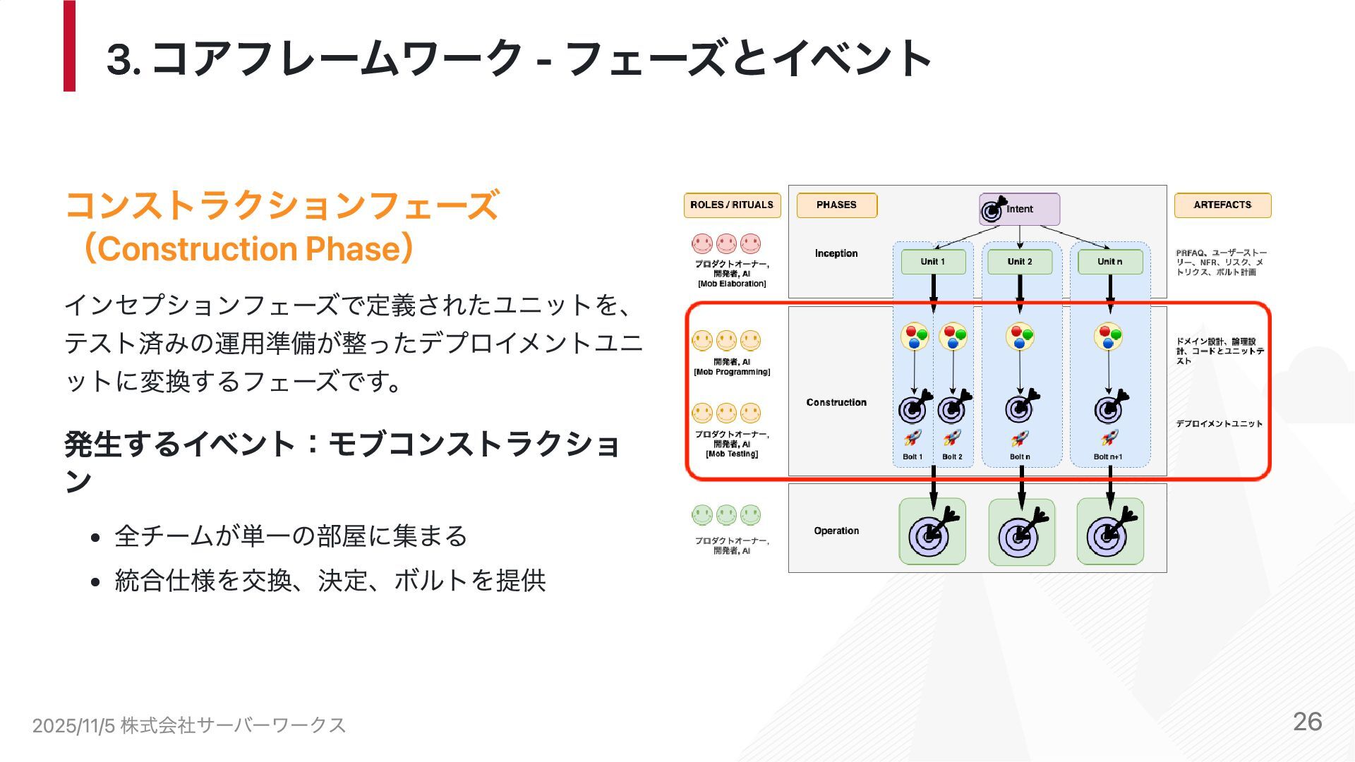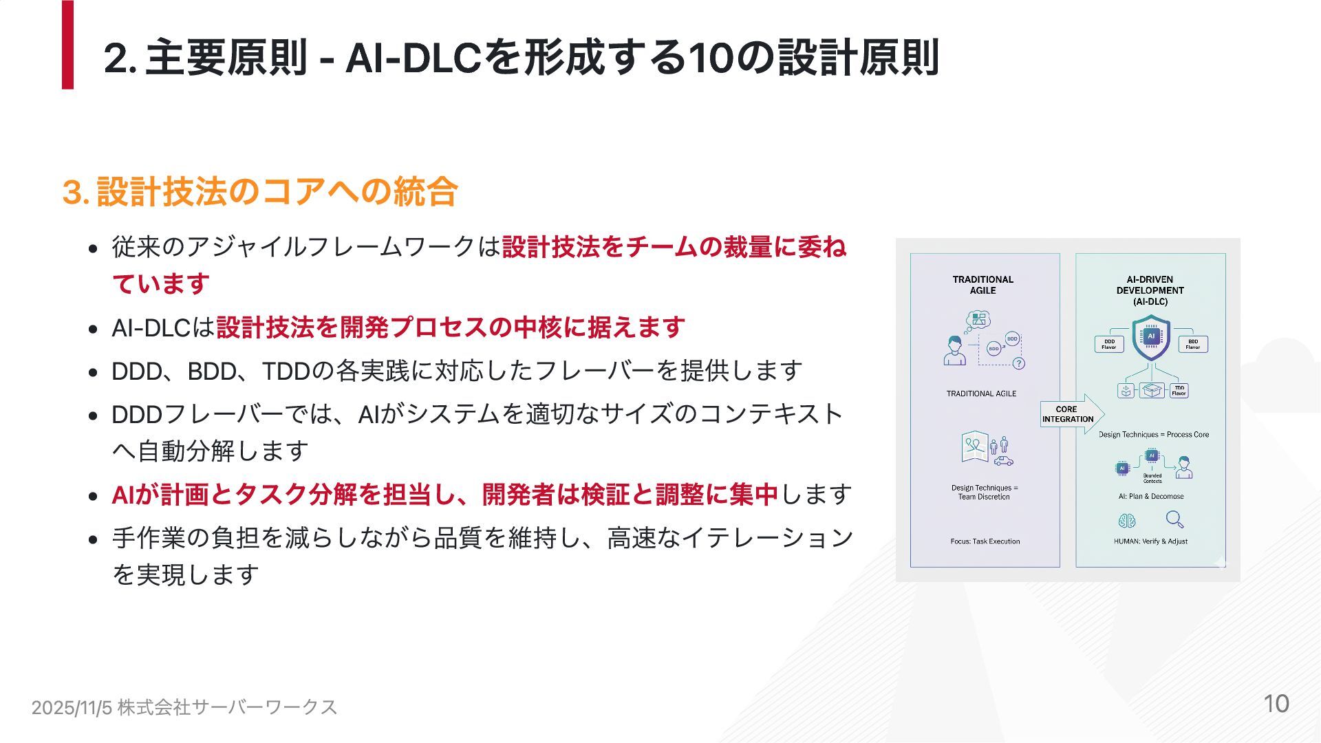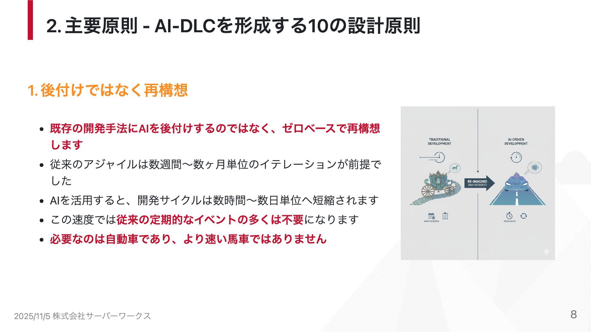 株式会社サーバーワークスの社内勉強会でAI駆動開発ライフサイクル(AI-DLC)や仕様駆動開発についての発表をしたときに作成した資料です。