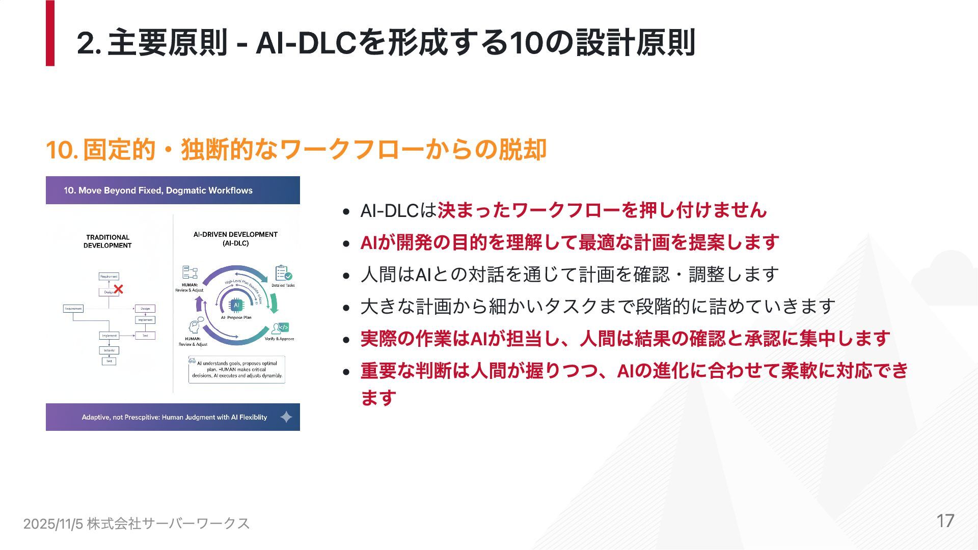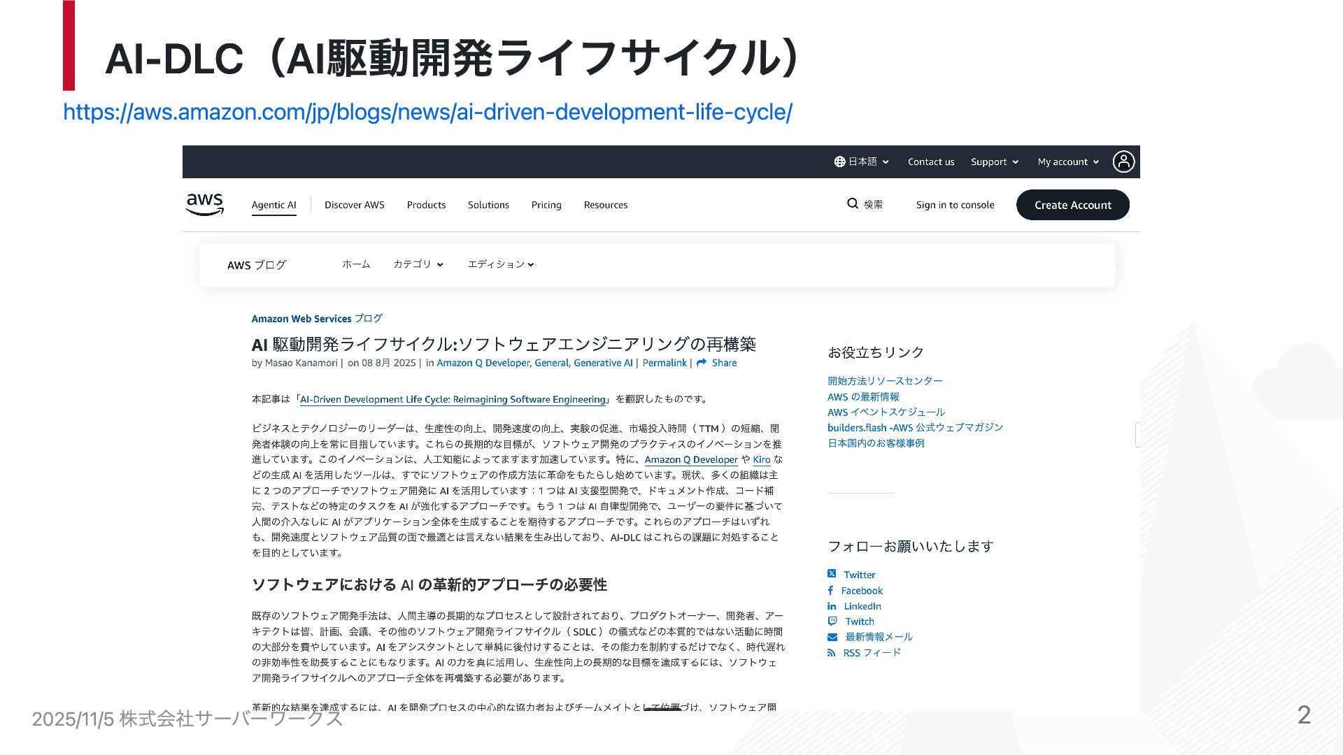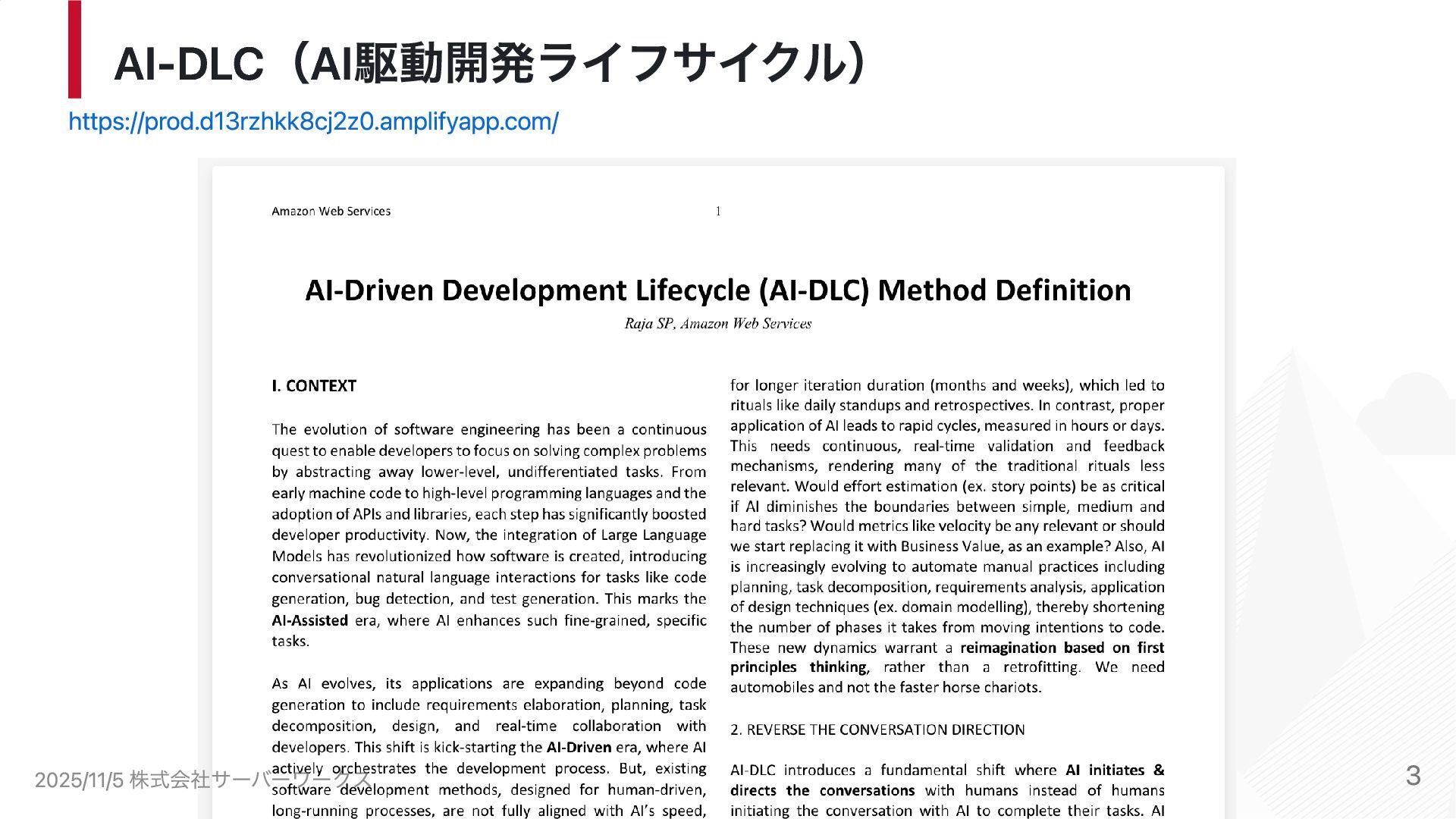 この勉強会の内容を記事にしたブログも公開しています。 ブログ記事も参考にしてください。 https://blog.serverworks.co.jp/ai-dlc-study-session-insights