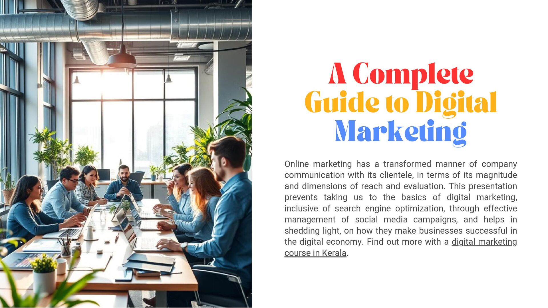 transformed manner of company communication with its clientele, in terms of its magnitude and dimensions of reach and evaluation. This presentation prevents taking us to the basics of digital marketing, inclusive of search engine optimization, through effective management of social media campaigns, and helps in shedding light, on how they make businesses successful in the digital economy. Find out more with a digital marketing course in Kerala.