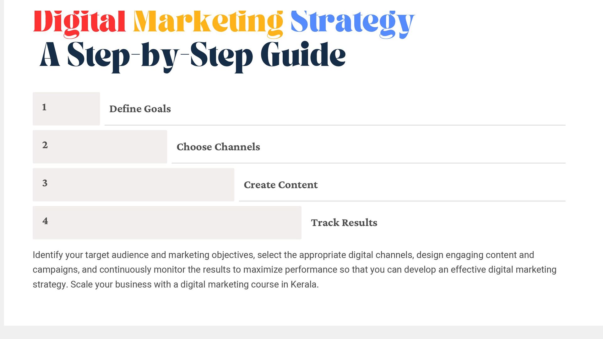 Choose Channels 3 Create Content 4 Track Results Identify your target audience and marketing objectives, select the appropriate digital channels, design engaging content and campaigns, and continuously monitor the results to maximize performance so that you can develop an effective digital marketing strategy. Scale your business with a digital marketing course in Kerala.