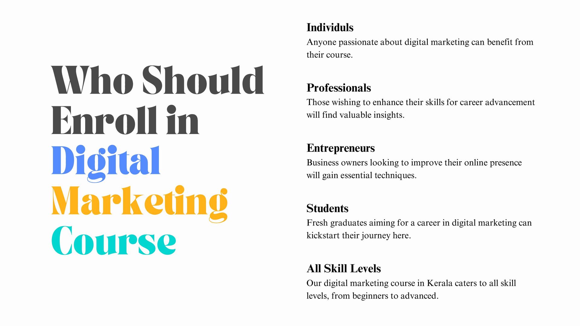 can kickstart their journey here. Individuls Anyone passionate about digital marketing can benefit from their course. Professionals Those wishing to enhance their skills for career advancement will find valuable insights. Entrepreneurs Business owners looking to improve their online presence will gain essential techniques. All Skill Levels Our digital marketing course in Kerala caters to all skill levels, from beginners to advanced. Who Should Enroll in Digital Marketing Course?