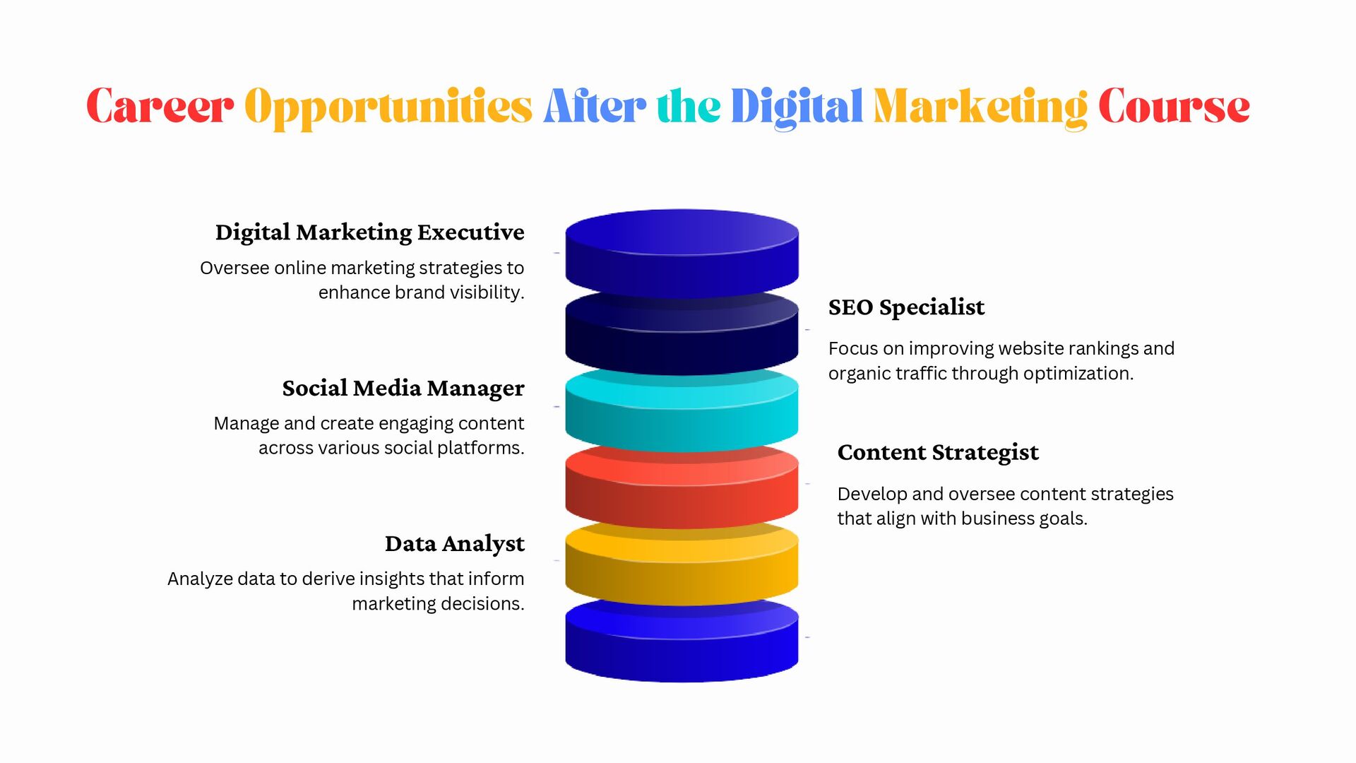 decisions. Social Media Manager Manage and create engaging content across various social platforms. Content Strategist Develop and oversee content strategies that align with business goals. Digital Marketing Executive Oversee online marketing strategies to enhance brand visibility. SEO Specialist Focus on improving website rankings and organic traffic through optimization. Career Opportunities After the Digital Marketing Course