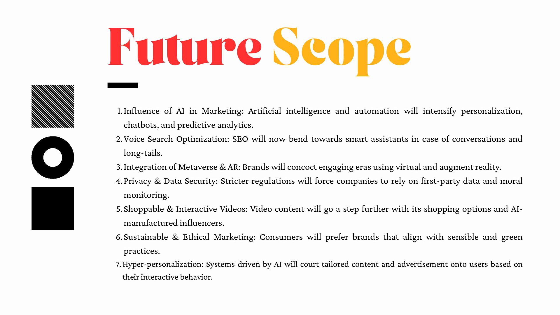 automation will intensify personalization, chatbots, and predictive analytics. 1. Voice Search Optimization: SEO will now bend towards smart assistants in case of conversations and long-tails. 2. Integration of Metaverse & AR: Brands will concoct engaging eras using virtual and augment reality. 3. Privacy & Data Security: Stricter regulations will force companies to rely on first-party data and moral monitoring. 4. Shoppable & Interactive Videos: Video content will go a step further with its shopping options and AI- manufactured influencers. 5. Sustainable & Ethical Marketing: Consumers will prefer brands that align with sensible and green practices. 6. Hyper-personalization: Systems driven by AI will court tailored content and advertisement onto users based on their interactive behavior. 7.