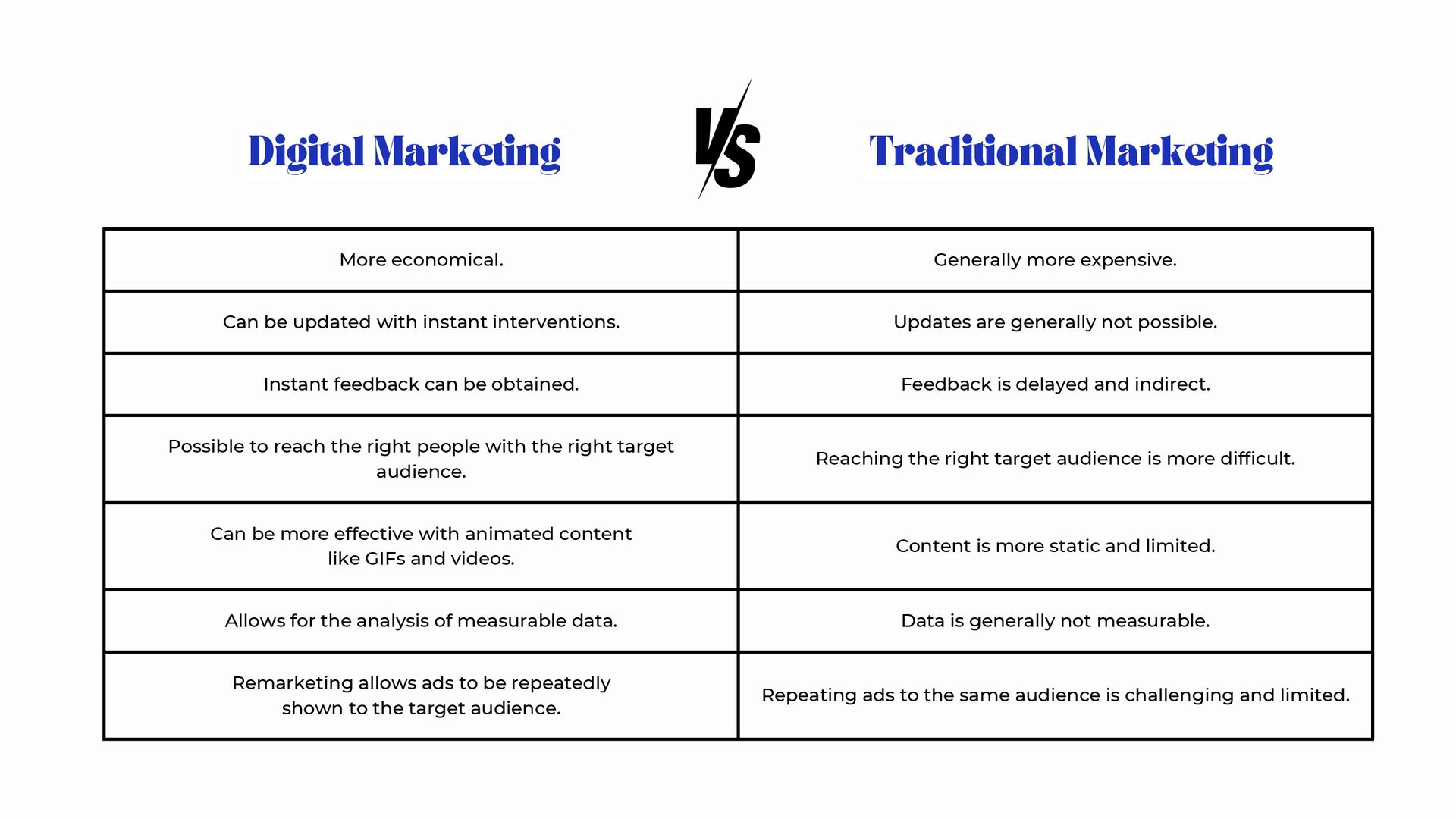 interventions. Updates are generally not possible. Instant feedback can be obtained. Feedback is delayed and indirect. Possible to reach the right people with the right target audience. Reaching the right target audience is more difficult. Can be more effective with animated content like GIFs and videos. Content is more static and limited. Allows for the analysis of measurable data. Data is generally not measurable. Remarketing allows ads to be repeatedly shown to the target audience. Repeating ads to the same audience is challenging and limited. Digital Marketing Traditional Marketing