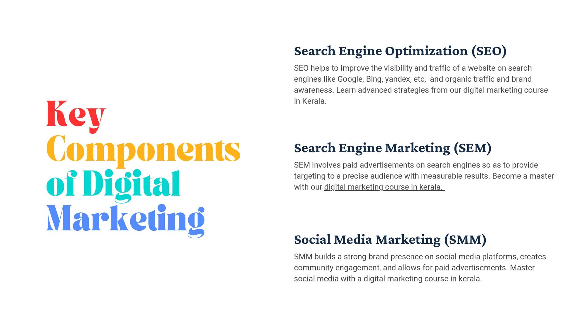 helps to improve the visibility and traffic of a website on search engines like Google, Bing, yandex, etc, and organic traffic and brand awareness. Learn advanced strategies from our digital marketing course in Kerala. Search Engine Marketing (SEM) SEM involves paid advertisements on search engines so as to provide targeting to a precise audience with measurable results. Become a master with our digital marketing course in kerala. Social Media Marketing (SMM) SMM builds a strong brand presence on social media platforms, creates community engagement, and allows for paid advertisements. Master social media with a digital marketing course in kerala.