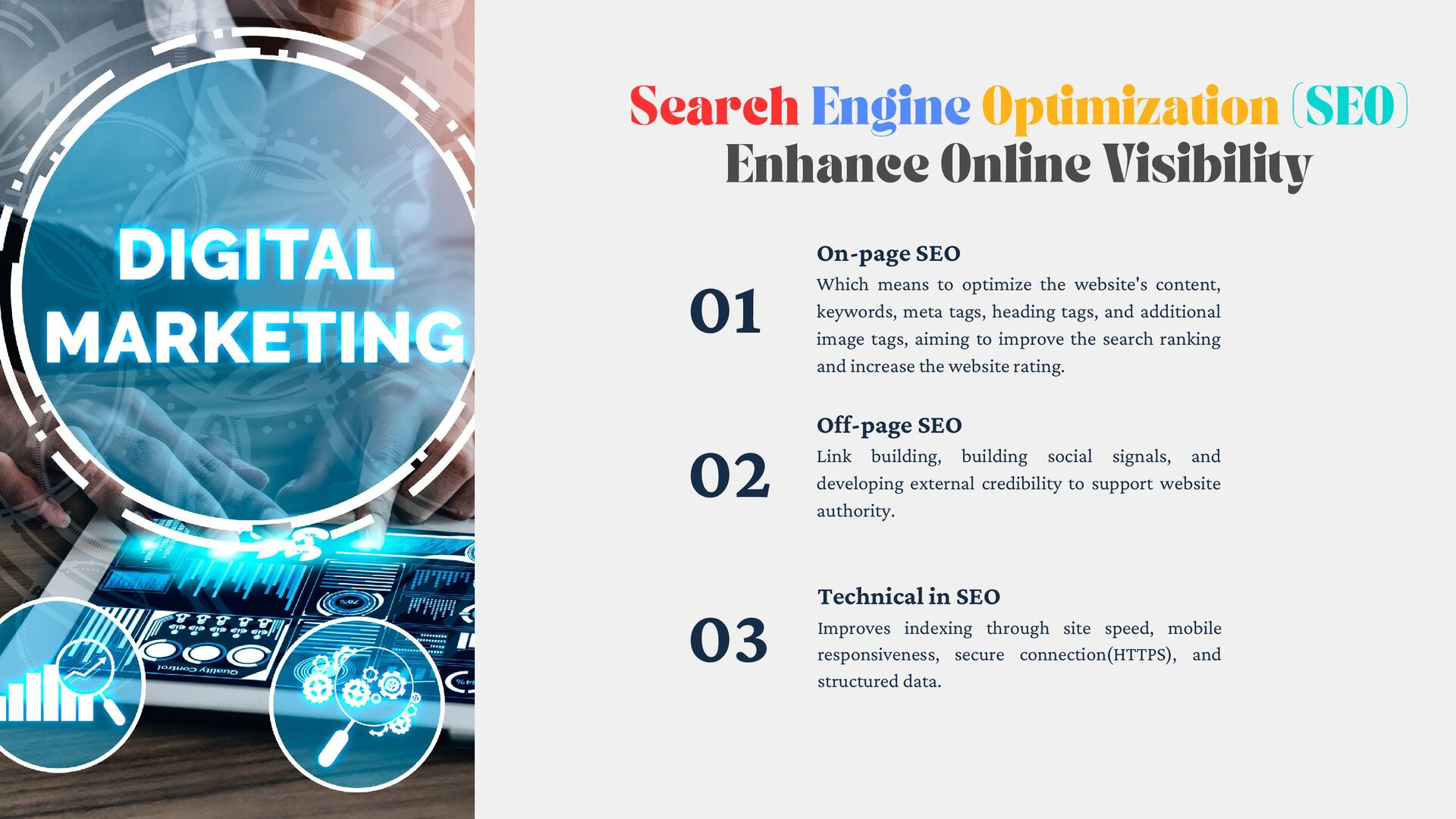 Technical in SEO Improves indexing through site speed, mobile responsiveness, secure connection(HTTPS), and structured data. Off-page SEO Link building, building social signals, and developing external credibility to support website authority. On-page SEO Which means to optimize the website's content, keywords, meta tags, heading tags, and additional image tags, aiming to improve the search ranking and increase the website rating.