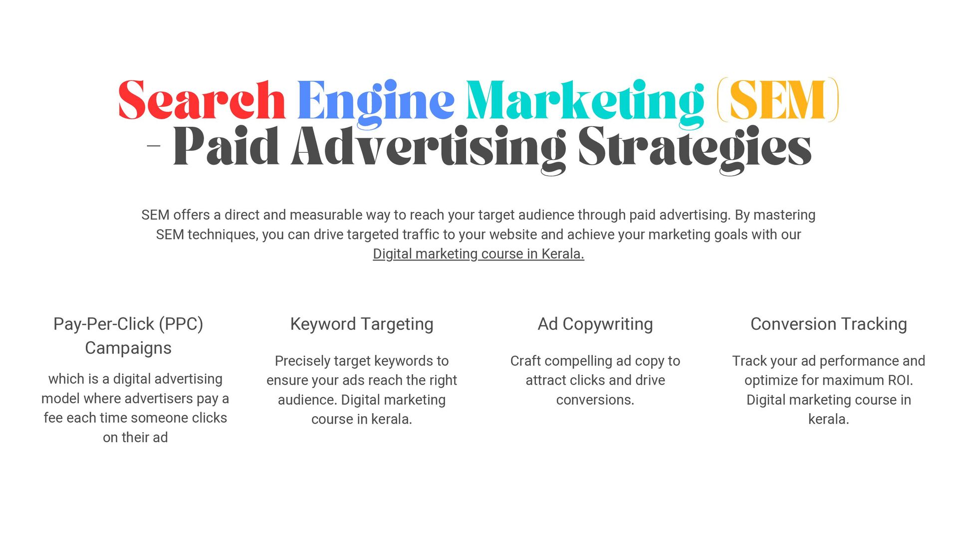 a direct and measurable way to reach your target audience through paid advertising. By mastering SEM techniques, you can drive targeted traffic to your website and achieve your marketing goals with our Digital marketing course in Kerala. Pay-Per-Click (PPC) Campaigns which is a digital advertising model where advertisers pay a fee each time someone clicks on their ad Ad Copywriting Craft compelling ad copy to attract clicks and drive conversions. Keyword Targeting Precisely target keywords to ensure your ads reach the right audience. Digital marketing course in kerala. Conversion Tracking Track your ad performance and optimize for maximum ROI. Digital marketing course in kerala.