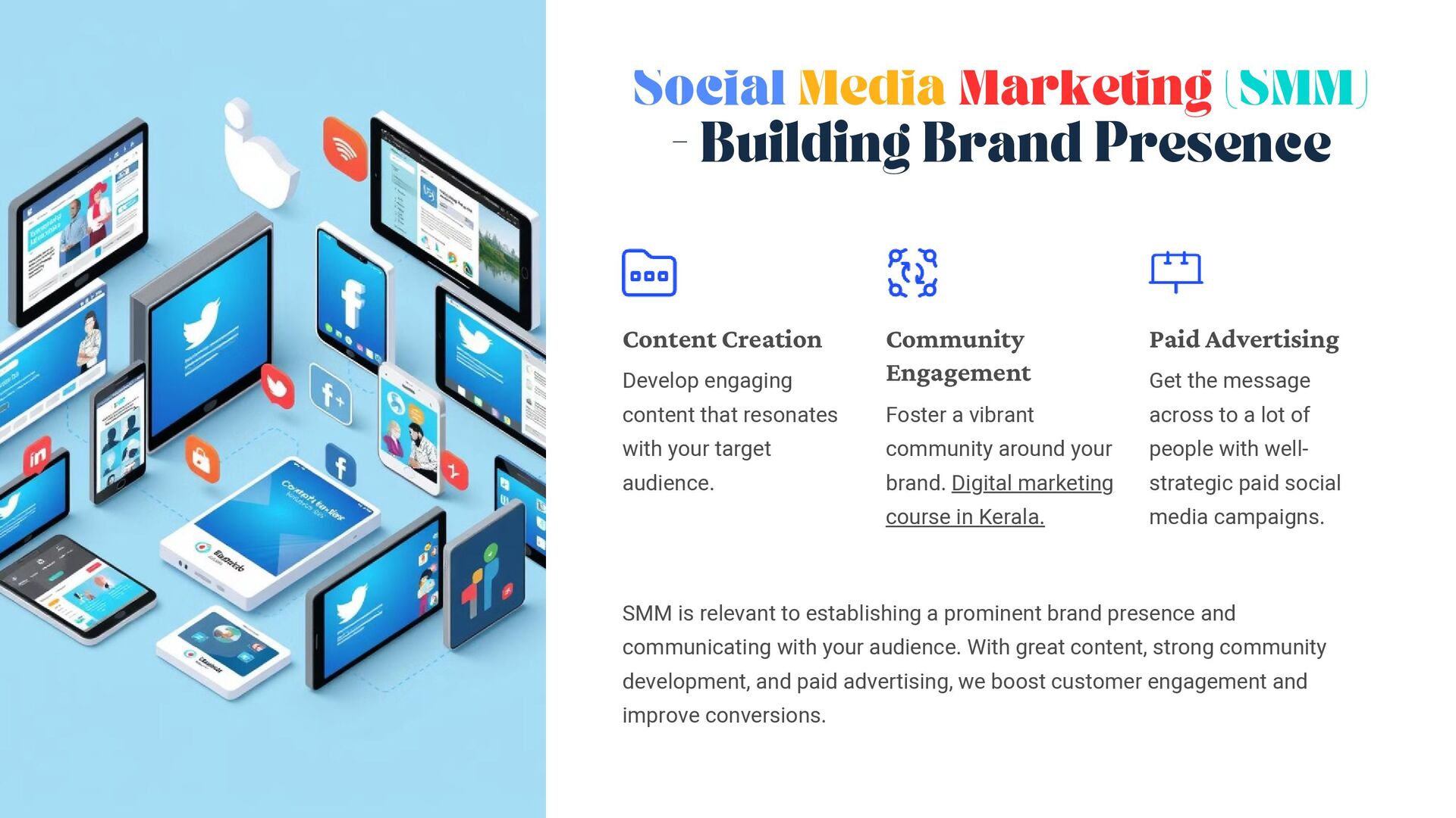 Develop engaging content that resonates with your target audience. Community Engagement Foster a vibrant community around your brand. Digital marketing course in Kerala. Paid Advertising Get the message across to a lot of people with well- strategic paid social media campaigns. SMM is relevant to establishing a prominent brand presence and communicating with your audience. With great content, strong community development, and paid advertising, we boost customer engagement and improve conversions.