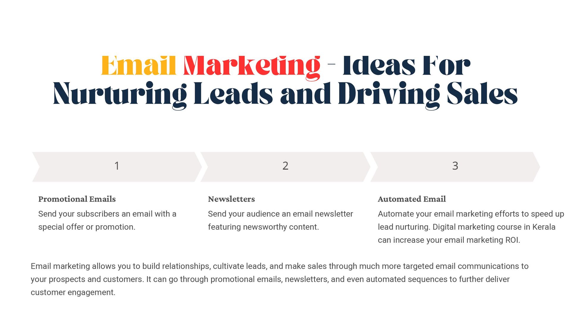 Promotional Emails Send your subscribers an email with a special offer or promotion. Newsletters Send your audience an email newsletter featuring newsworthy content. Automated Email Automate your email marketing efforts to speed up lead nurturing. Digital marketing course in Kerala can increase your email marketing ROI. Email marketing allows you to build relationships, cultivate leads, and make sales through much more targeted email communications to your prospects and customers. It can go through promotional emails, newsletters, and even automated sequences to further deliver customer engagement.