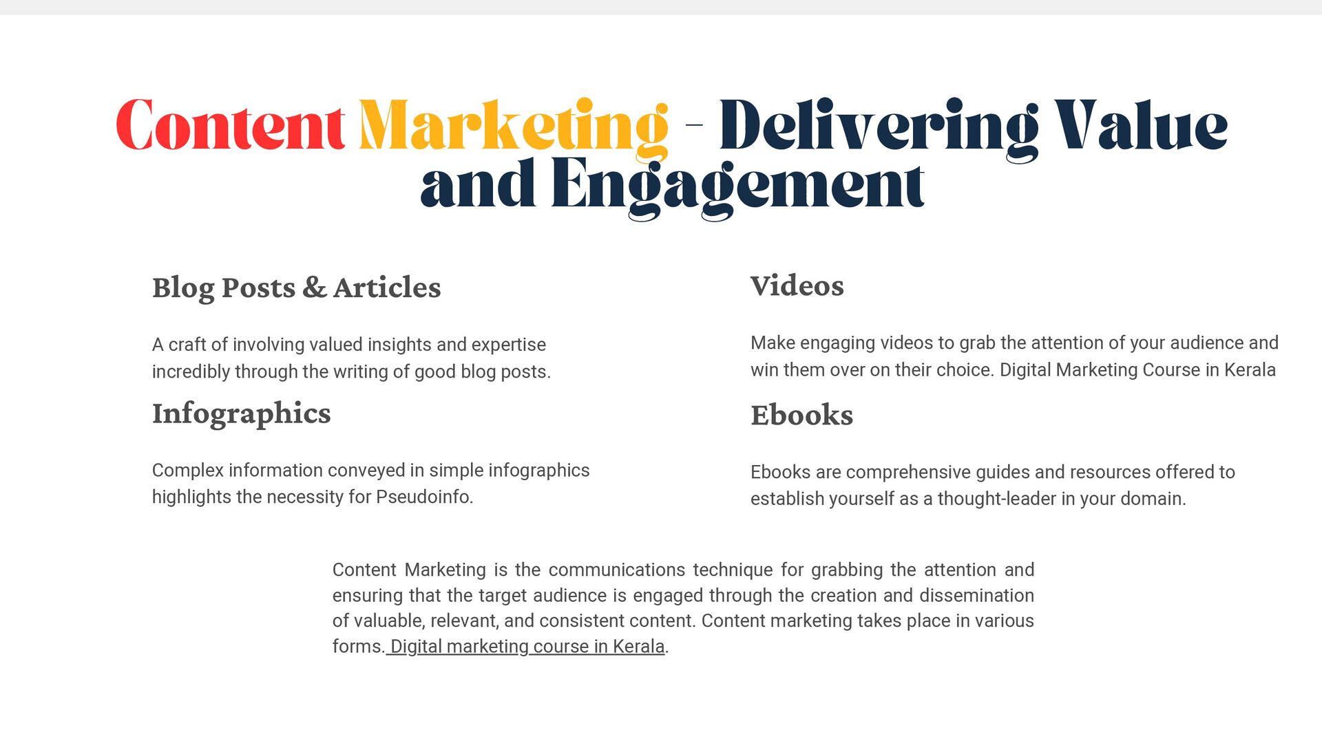 and ensuring that the target audience is engaged through the creation and dissemination of valuable, relevant, and consistent content. Content marketing takes place in various forms. Digital marketing course in Kerala. Content Marketing - Delivering Value and Engagement Videos Make engaging videos to grab the attention of your audience and win them over on their choice. Digital Marketing Course in Kerala Blog Posts & Articles A craft of involving valued insights and expertise incredibly through the writing of good blog posts. Infographics Complex information conveyed in simple infographics highlights the necessity for Pseudoinfo. Ebooks Ebooks are comprehensive guides and resources offered to establish yourself as a thought-leader in your domain.