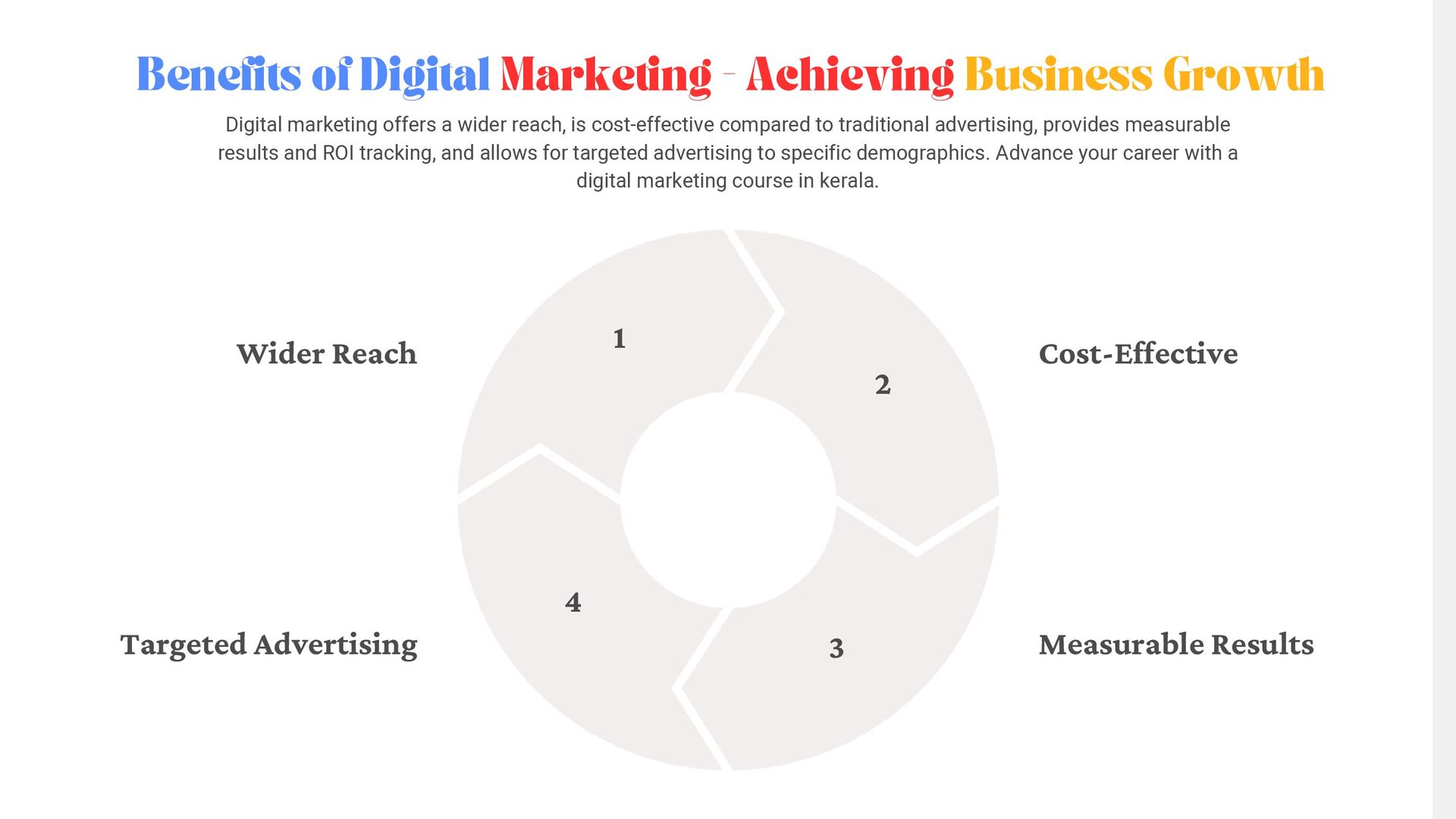 4 Benefits of Digital Marketing - Achieving Business Growth Digital marketing offers a wider reach, is cost-effective compared to traditional advertising, provides measurable results and ROI tracking, and allows for targeted advertising to specific demographics. Advance your career with a digital marketing course in kerala.