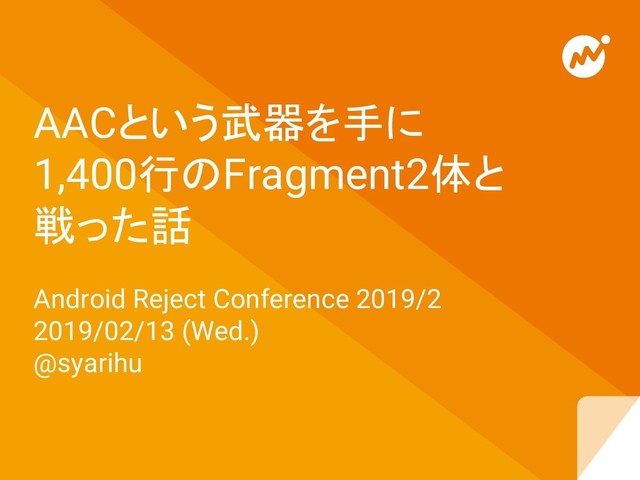 AACという武器を手に 1,400行のFragment2体と 戦った話 Android Reject Conference 2019/2 2019/02/13 (Wed.) @syarihu