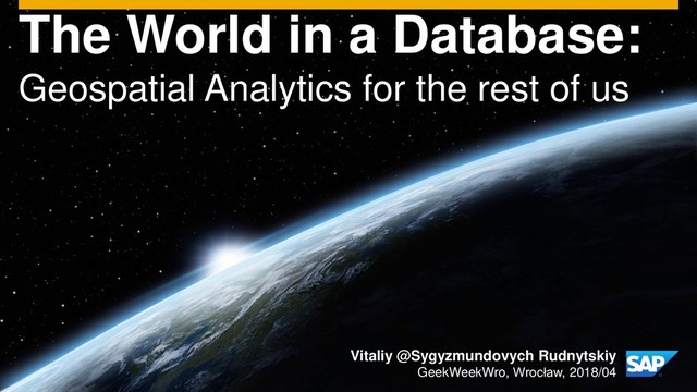rights reserved. 1 Public The World in a Database: Geospatial Analytics for the rest of us Vitaliy @Sygyzmundovych Rudnytskiy GeekWeekWro, Wrocław, 2018/04