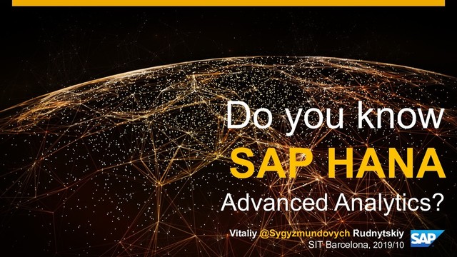 rights reserved. 26 Public openSAP course (archived): Analyzing Connected Data with SAP HANA Graph Course Characteristics Duration: 4 weeks (4-5 hours in total) Course Content Unit 1: Connected Data and SAP HANA Graph Unit 2: The Basics: Nodes, Edges, and Workspaces Unit 3: Pattern Matching Unit 4: Built-In Algorithms Unit 5: GraphScript Unit 6: SAP HANA Hierarchies Unit 7: Beyond Graph: Full-Text Search and Spatial https://open.sap.com/courses/hsgra1 @Sygyzmundovych