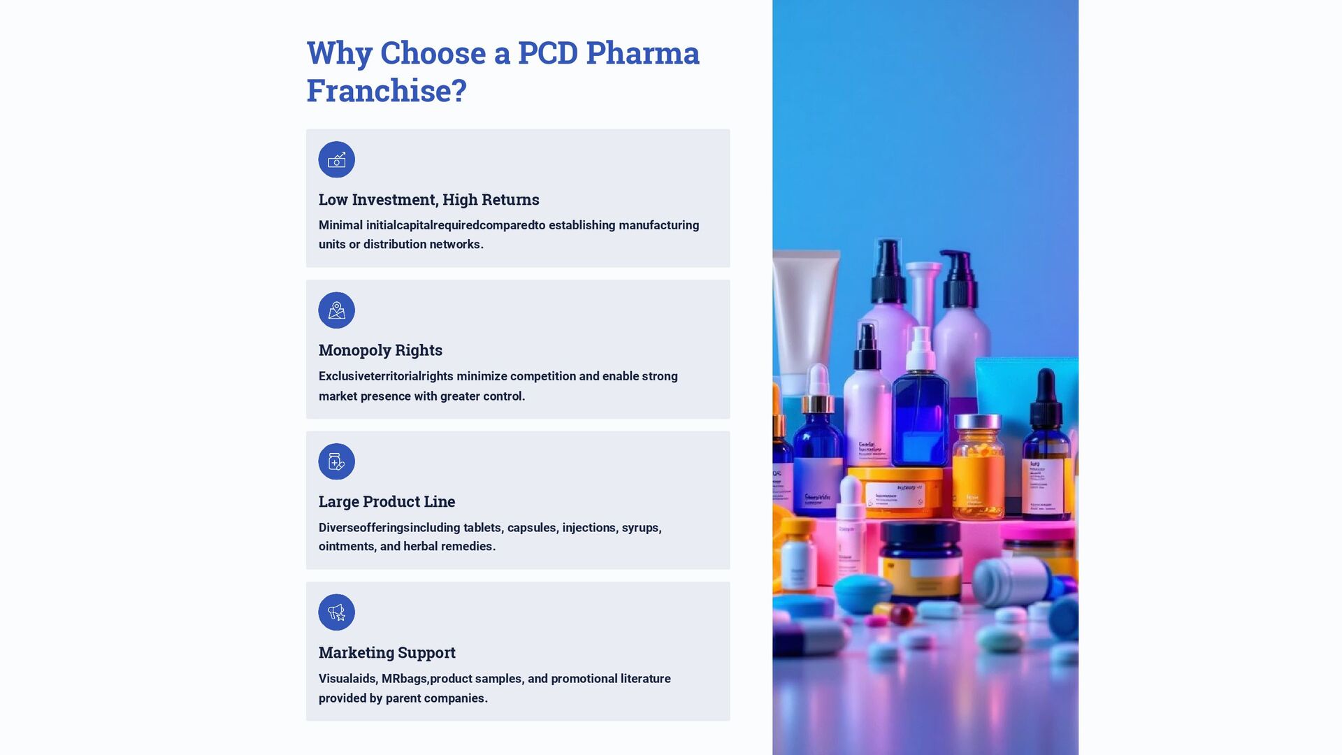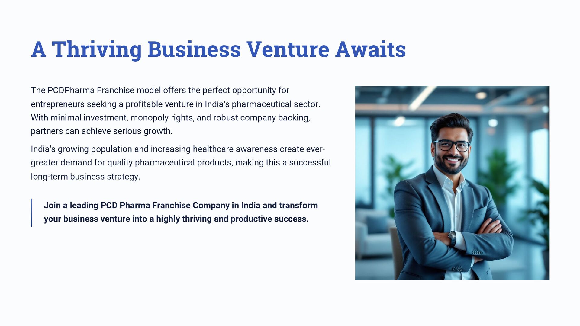 the perfect opportunity for entrepreneurs seeking a profitable venture in India's pharmaceutical sector. With minimal investment, monopoly rights, and robust company backing, partners can achieve serious growth. India's growing population and increasing healthcare awareness create ever- greater demand for quality pharmaceutical products, making this a successful long-term business strategy. Join a leading PCD Pharma Franchise Company in India and transform your business venture into a highly thriving and productive success.