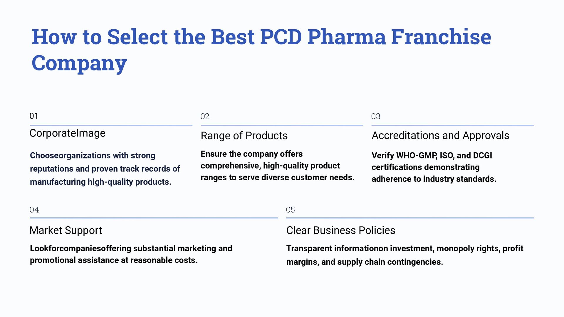 03 04 05 Chooseorganizations with strong reputations and proven track records of manufacturing high-quality products. Lookforcompaniesoffering substantial marketing and promotional assistance at reasonable costs. Transparent informationon investment, monopoly rights, profit margins, and supply chain contingencies. CorporateImage 01 Ensure the company offers comprehensive, high-quality product ranges to serve diverse customer needs. Range of Products Verify WHO-GMP, ISO, and DCGI certifications demonstrating adherence to industry standards. Accreditations and Approvals Market Support Clear Business Policies