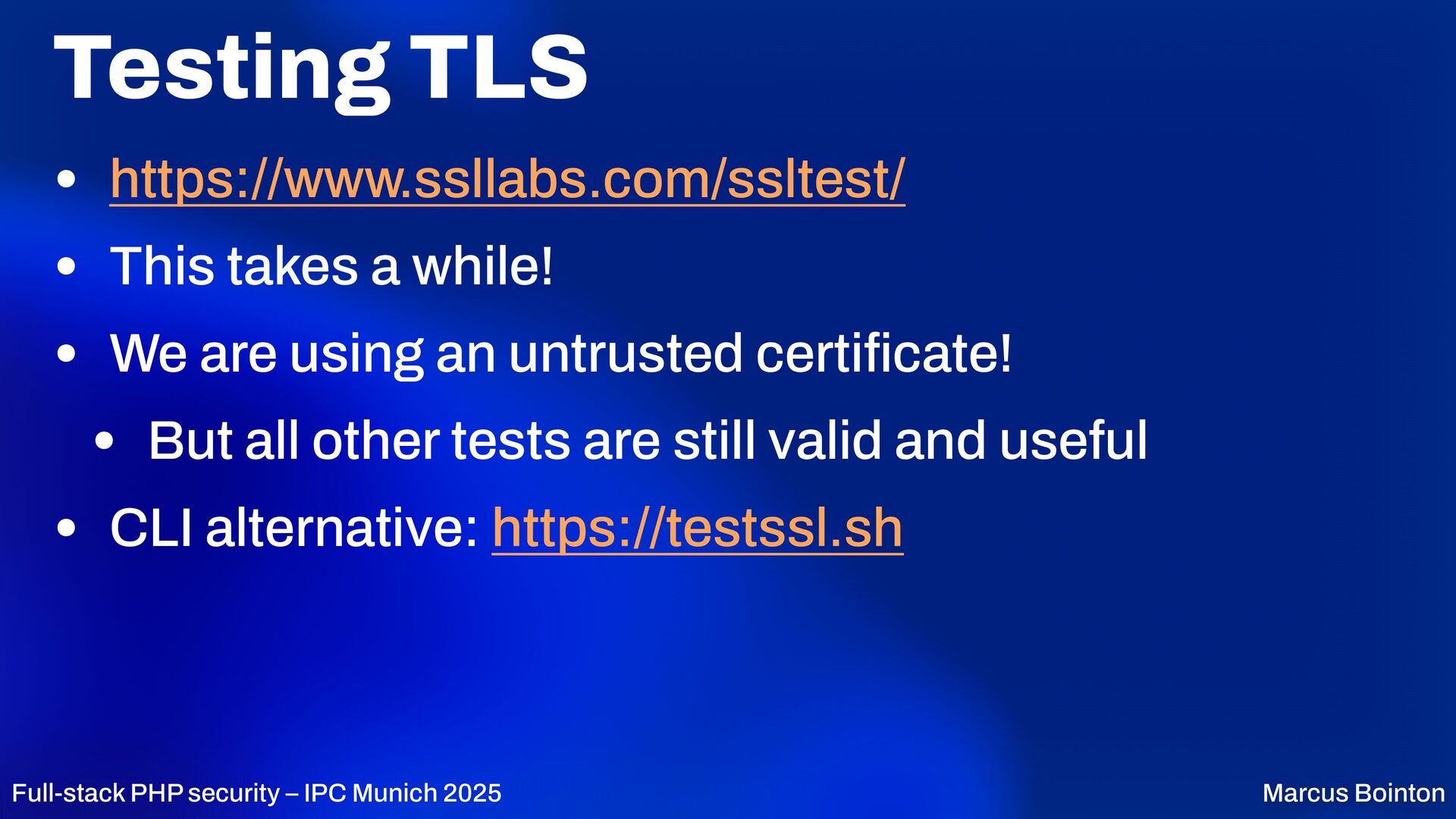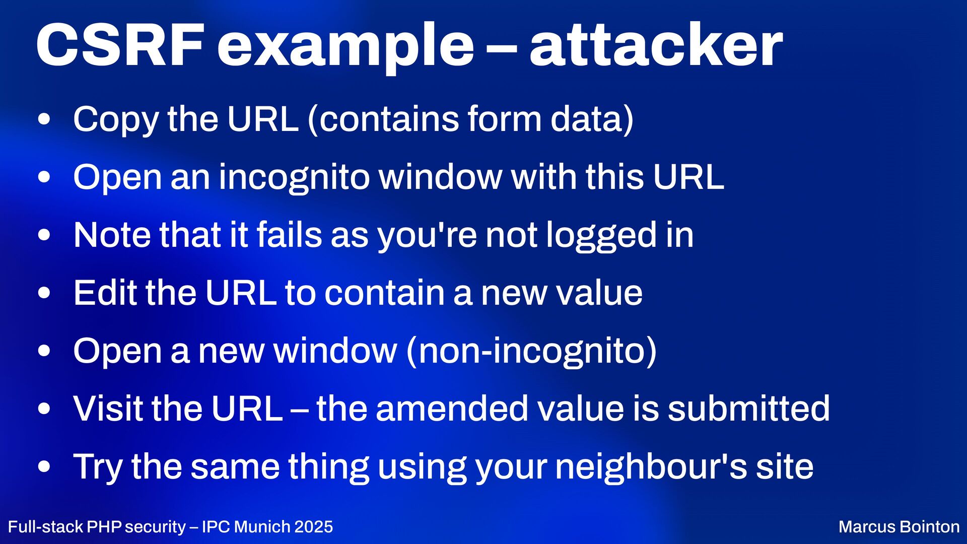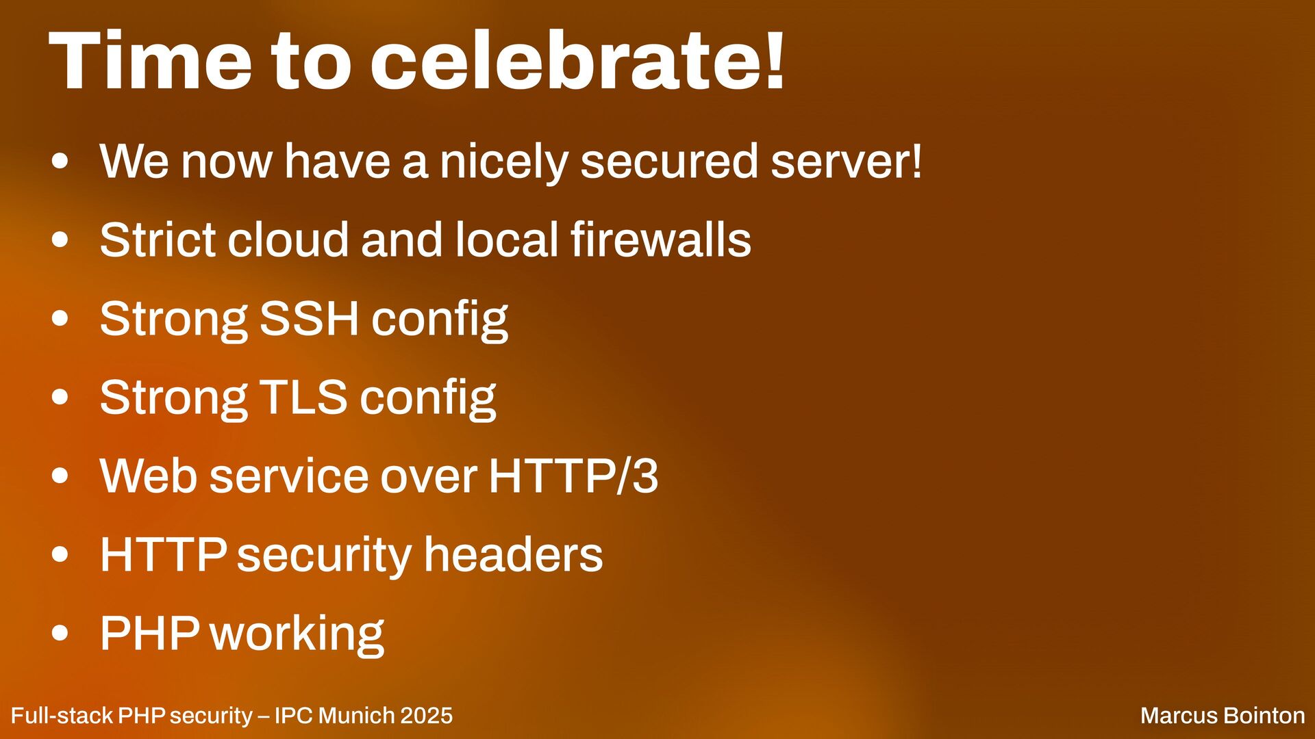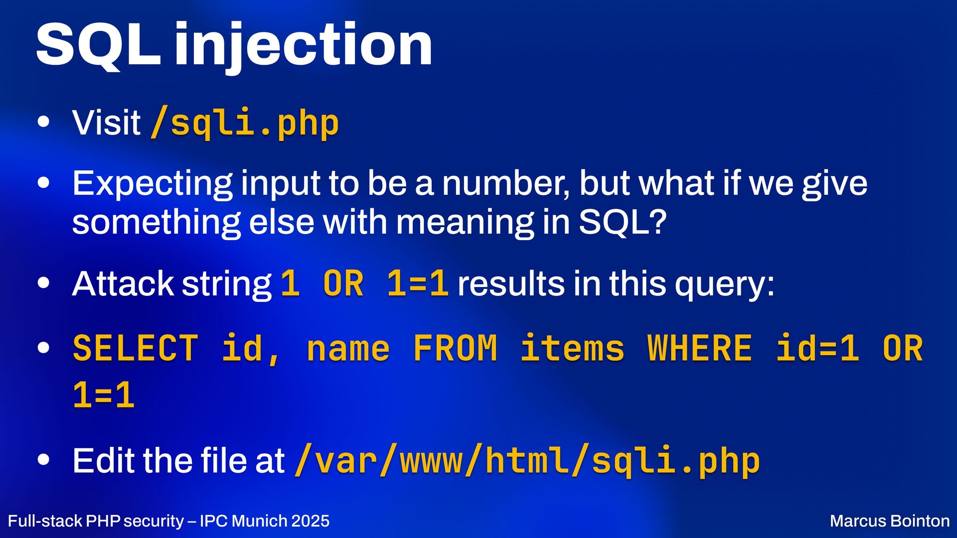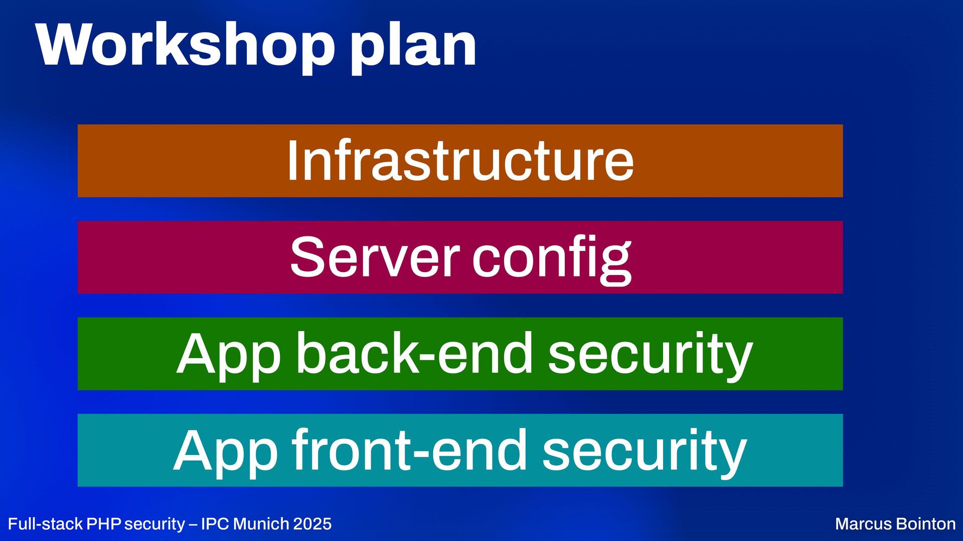 In this 1-day workshop, we will set up a server and work through a set of examples in vanilla PHP to discuss and demonstrate security problems and solutions at every layer of the deployment stack, from cloud infrastructure all the way through firewalls, SSH & TLS config, SQLi, validation & escaping, and XSS.