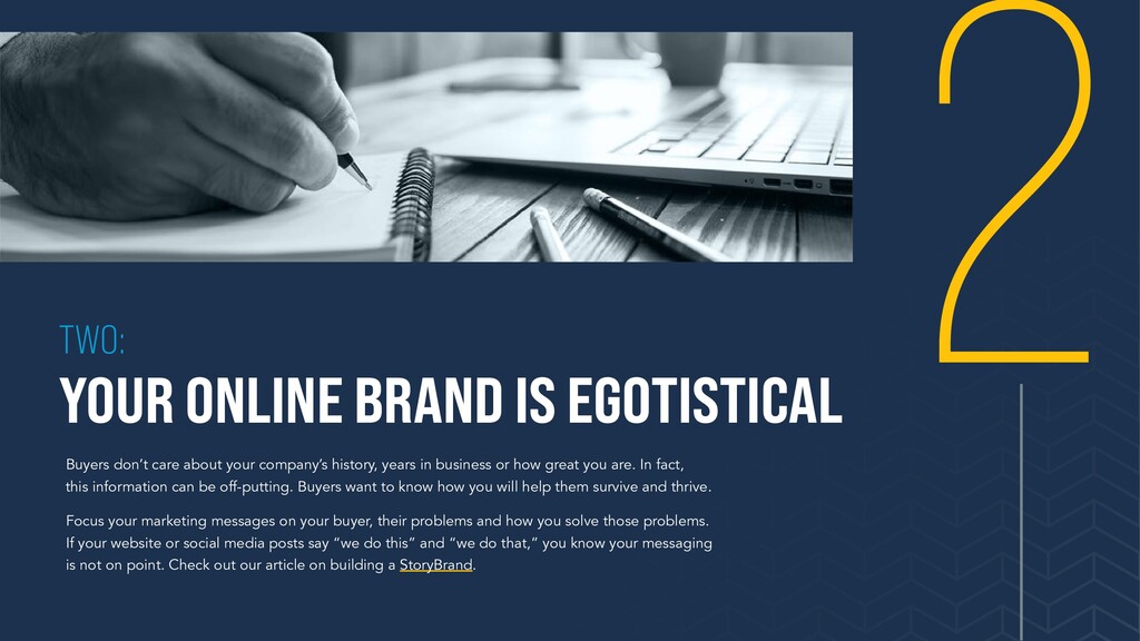Your competitors are out-performing you and they are stealing your leads. Online marketing is a competitive game more akin to battleship than hide-and-seek. You are competing directly with your competitors, whether you know them or not. • Identify who your target customers are and what their pains are in relation to your brand. Then, identify where they go to learn about how they will solve these problems. • Focus a majority of your sales and marketing efforts and budget on the most productive channels and seek to dominate that channel (i.e., content, social media, search engine optimization, email, paid advertising, etc.) • Consider a multichannel approach. Attract the right buyers with engaging content through inbound marketing, seek and hunt your target audience through outbound marketing and target and engage large accounts through account-based marketing (ABM). You need to be relevant to your buyers when they are researching how to solve their problems.