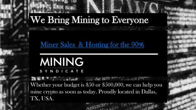 hosting service available at Mining Syndicate. They offer mining hosting with remote access to your miner. Visit their website for crypto mining hosting.