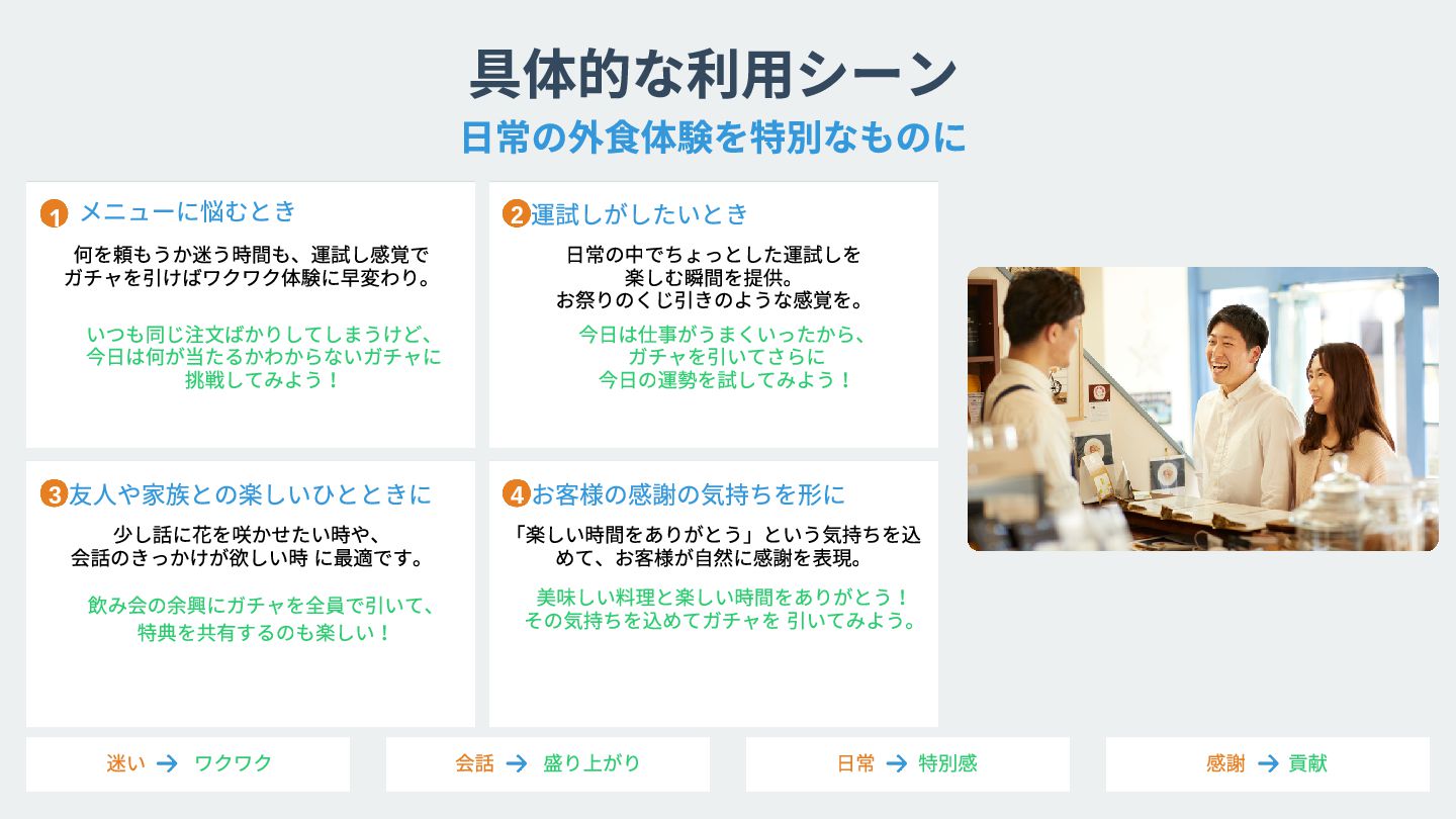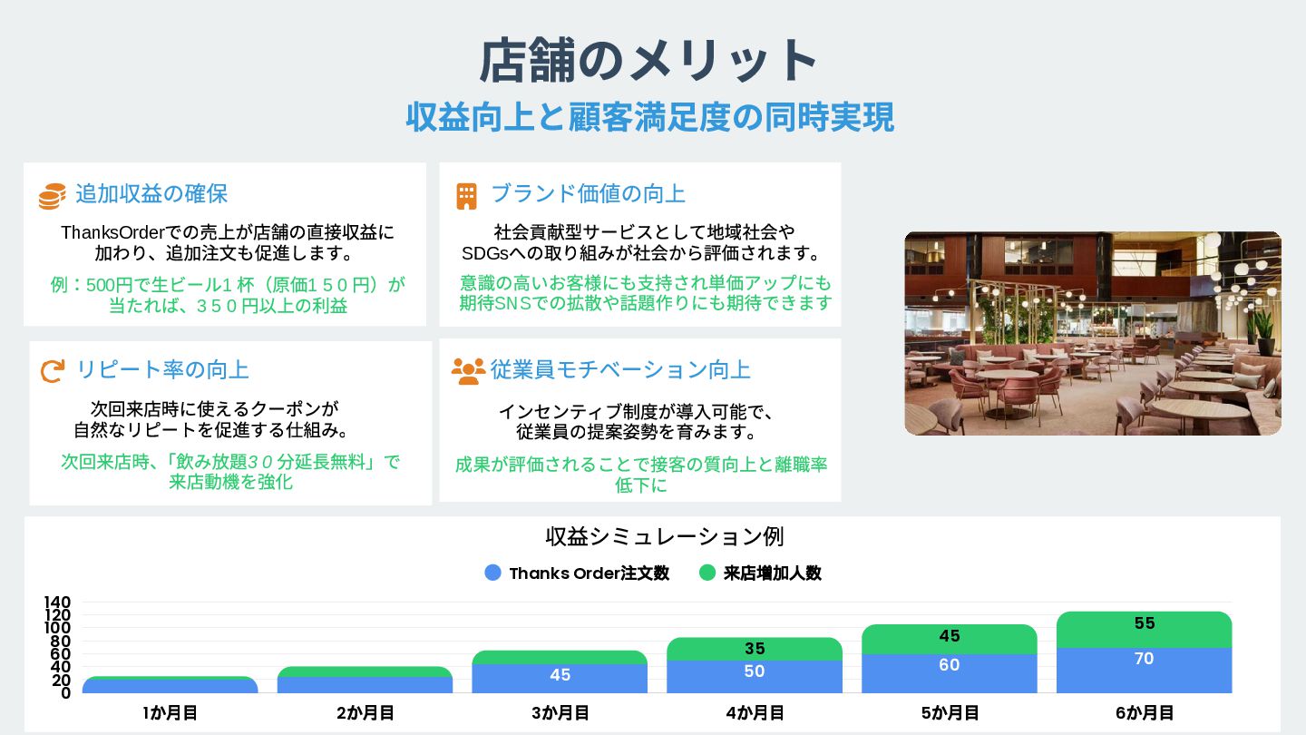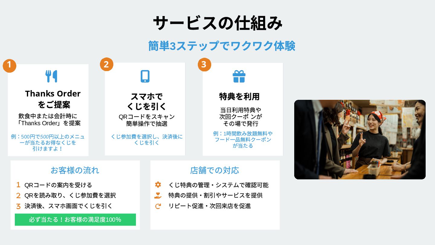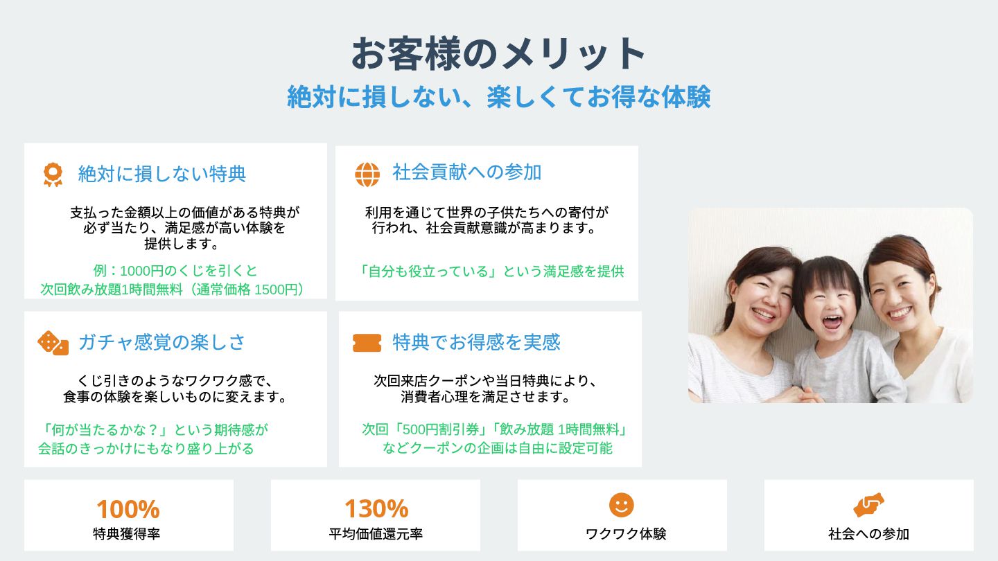 店舗の現状や課題を お聞かせください。 最適な導入プランを ご提案いたします。 東京都港区六本木5 丁目13番6号 決済システムとの連携や QR コードの設置を行います。 運用開始後も継続的にサポート。 効果測定と改善提案を行います。 導入費用や運用方法について詳しくご説明いたします Win-Win-Win の関係を実現 店舗規模に応じたプラン設計 特典内容のカスタマイズ 導入スケジュールの調整 追加収益の確保 簡単な設定で即日利用可能 既存システムとの連携 ス タッフ向け操作研修 楽しい体験提供 万全なサポート体制 月次レポートの提供 継続的な改善提案 モチベーション向上 ブランド価値向上