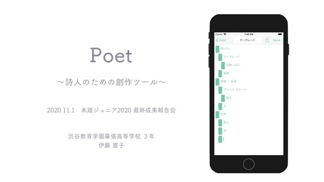 『Poet 〜詩人のための創作ツール〜』の、未踏ジュニア2020最終成果報告会のスライドです。
