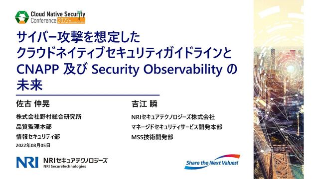 rights reserved. 「クラウドにおけるセキュリティ」をどう対策するか? サイバー攻撃を想定したクラウドネイティブセキュリティガイドラインとCNAPP及びSecurity Observabilityの未来 ◼CIS Benchmarks は、非常に広範囲な製品・サービスを対象とするドキュメント群 ⚫ 各クラウドプロバイダ、Docker/Kubernetes、OS/ミドルなどをカバー ⚫ 以下の観点では対策が手薄なので、追加対策を実施 • コンテナイメージの署名、レジストリの定期・依存関係先スキャン、CI/CDパイプライン保護、バージョン管理 カテゴリ 対象の製品・サービス(例) Cloud Provider Alibaba Cloud, Amazon Web Services, Microsoft Azure, Google Cloud Platform, IBM Cloud, OCI Desktops & Web Browsers Apple Desktop OSX, Apple Safari Browser, Google Chrome, Microsoft Internet Explorer, Microsoft Windows Desktop 10/XP/NT, Mozilla Firefox Browser, Opera Browser, Mobile Devices, Zoom Mobile Devices Apple Mobile Platform iOS, Google Mobile Platform Network Devices Agnostic Print Devices, Check Point Firewall, Cisco Firewall Devices, Cisco Routers/Switches IOS, Cisco Wireless LAN Controller, Juniper Routers/Switches JunOS, Palo Alto Networks Server Software - Operating Systems Amazon Linux, CentOS, Debian Linux Server, IBM AIX Server, IBM Z series, Microsoft Windows Server, Novell Netware, Oracle Linux, Oracle Solaris Server, Red Hat Linux Server, Slackware Linux Server, SUSE Linux Enterprise Server, Ubuntu LTS Server Server Software - Other Apache HTTP Server, Apache Tomcat Server, BIND DNS Server, FreeRADIUS, Microsoft IIS Server, IBM DB2 Server, Microsoft Exchange, Microsoft SharePoint Server, Microsoft SQL Server, MIT Kerberos, MySQL Database Server, Novell eDirectory, OpenLDAP Server, Oracle Database Server, PostgreSQL Database Server, Sybase Database Server Security Metrics Quick Start Guide, Security Metrics Virtualization Platforms Agnostic VM Server, Docker, Kubernetes, VMware Server, Xen Server Other Microsoft Access, Microsoft Excel, Microsoft Office, Microsoft Outlook , Microsoft PowerPoint, Microsoft Word 出典:CIS Benchmarks | CIS