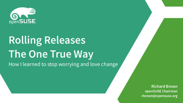 Attribution-ShareAlike 4.0 International license. It can be shared and adapted for any purpose (even commercially) as long as Attribution is given and any derivative work is distributed under the same license. Details can be found at https://creativecommons.org/licenses/by-sa/4.0/ General Disclaimer This document is not to be construed as a promise by any participating organisation to develop, deliver, or market a product. It is not a commitment to deliver any material, code, or functionality, and should not be relied upon in making purchasing decisions. openSUSE makes no representations or warranties with respect to the contents of this document, and specifically disclaims any express or implied warranties of merchantability or fitness for any particular purpose. The development, release, and timing of features or functionality described for openSUSE products remains at the sole discretion of openSUSE. Further, openSUSE reserves the right to revise this document and to make changes to its content, at any time, without obligation to notify any person or entity of such revisions or changes. All openSUSE marks referenced in this presentation are trademarks or registered trademarks of SUSE LLC, in the United States and other countries. All third-party trademarks are the property of their respective owners. Credits Template Richard Brown
