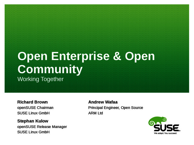 SUSE Linux Enterprise is able to provide the solid platform to customers thanks largely to a community project that experiments and implements many of the innovative technologies that you see in commercial products today. That community project is openSUSE. This session will discuss the latest developments in the openSUSE Project, shed light on other technologies being developed inside openSUSE, and share insights into some possibilities for the future. It will also detail areas where the openSUSE project directly impacts Enterprise customers, and the benefits of SLE customers being more involved as community members.