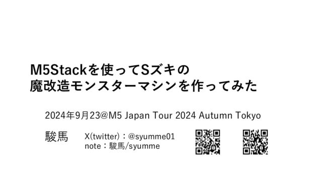 SズキのNHK「魔改造の夜」出場モンスターマシンDEN-RACE Solo 通信や制御はM5Stackを活用して短期開発しました。 実は、M5Stackを使った手のひらサイズロボット スタックチャン と同様の制御をしています。 そこで今回は、開発零号機のマイコンを スタックチャン に置き換えてLTで実演操縦しました。 M5 Japan Tour 2024 Autumn 東京のLT発表資料です。(2024/9/23)